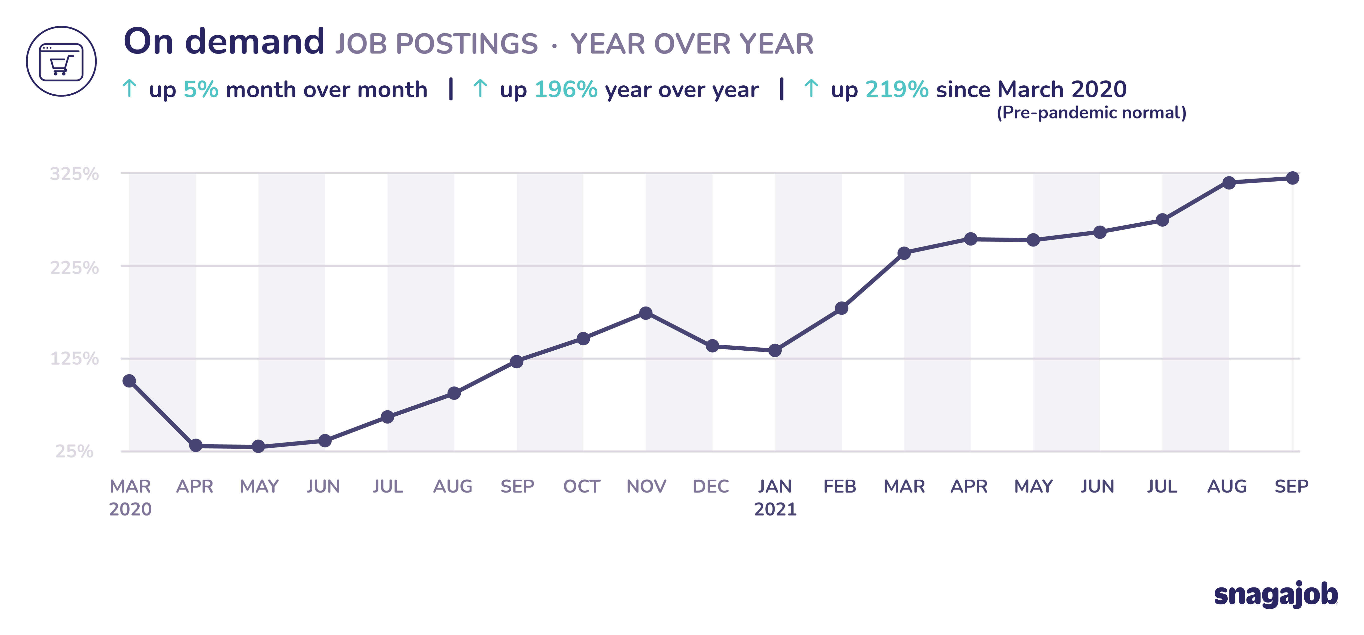 On demand jobs are up 219% compared to pre-pandemic norms, seeing 5% month over month growth and 196% year over year growth.