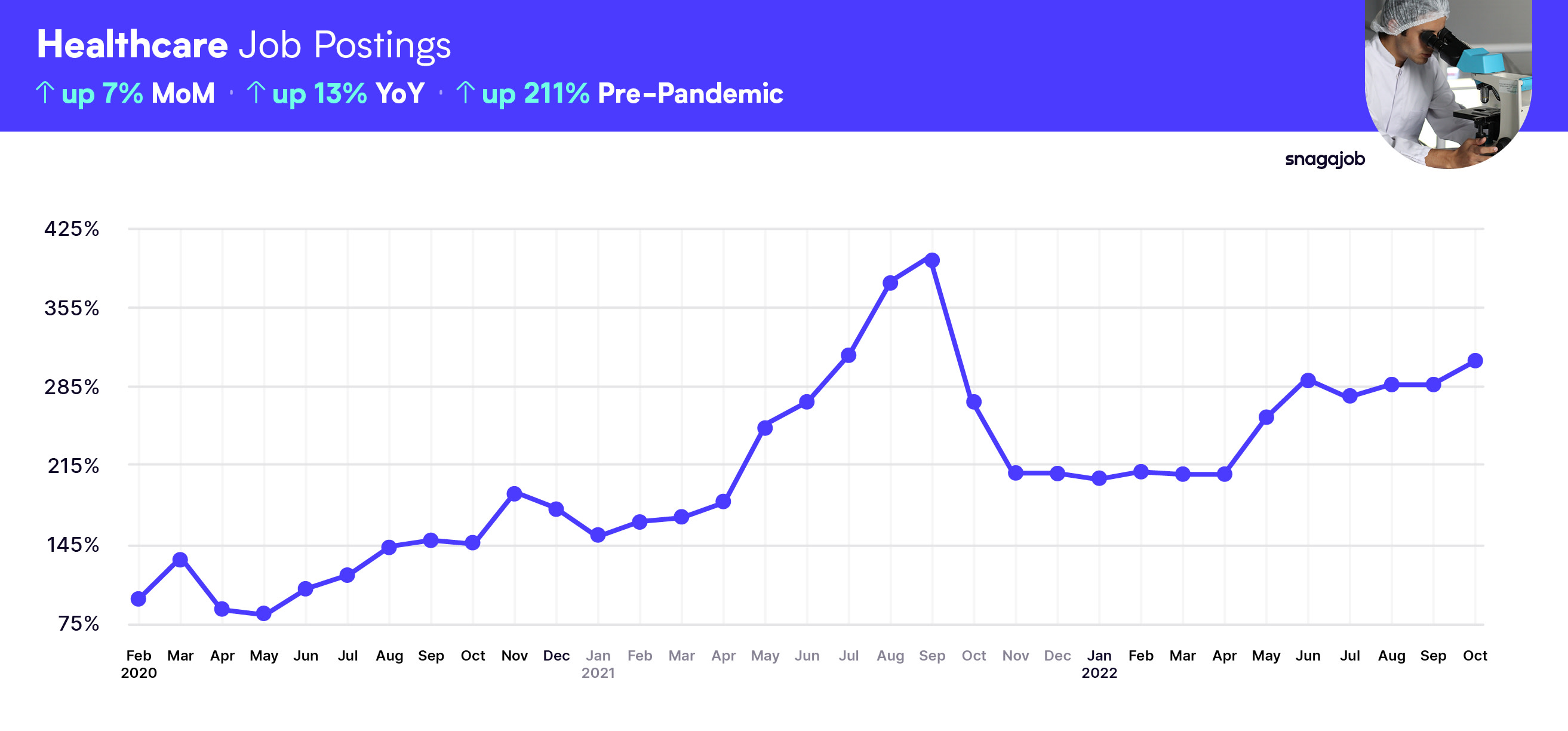 Healthcare jobs are up 211% compared to pre-pandemic norms, seeing a 7% month-over-month gain, and a 13% year-over-year growth.