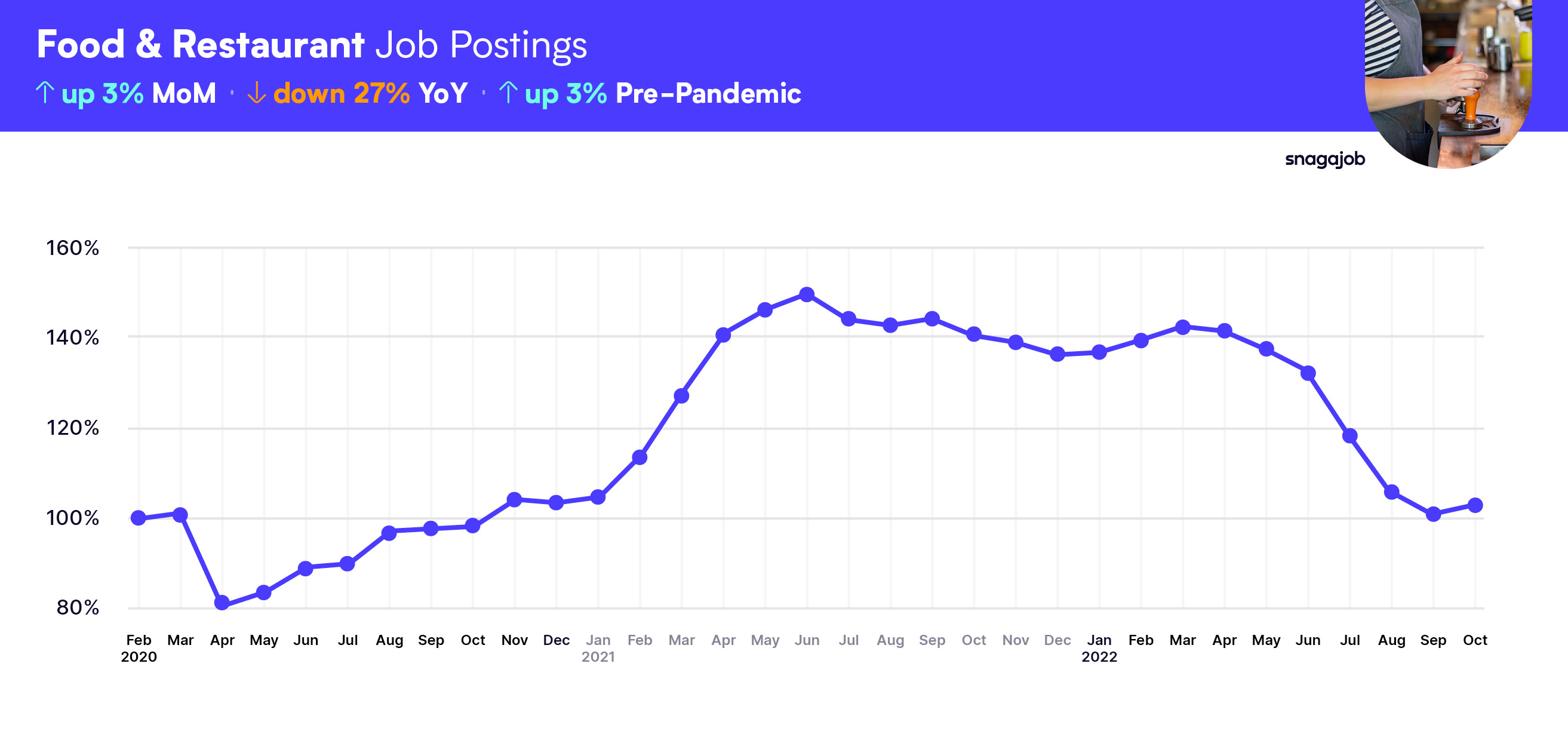 Food & Restaurant jobs are up 3% compared to pre-pandemic norms, seeing a 3% month-over-month gain, and a 27% year-over-year decline.