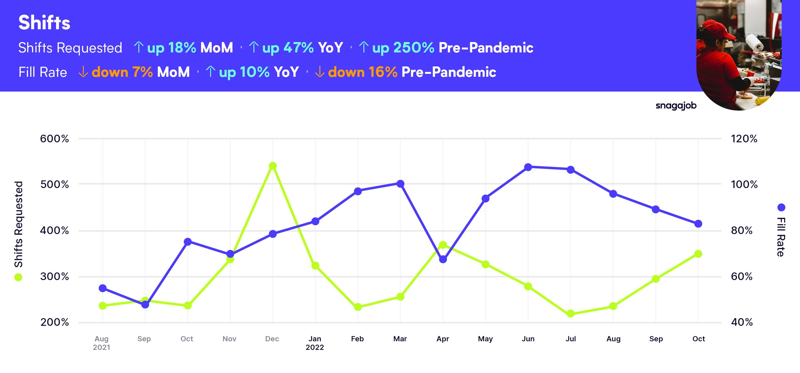 Shifts by Snagajob requested shifts are up 250% compared to pre-pandemic norms, seeing an 18% month-over-month gain, and a 47% year-over-year growth. Fill rates are down 16% compared to pre-pandemic norms, seeing a 7% month-over-month decline, and a 10% year-over-year growth.
