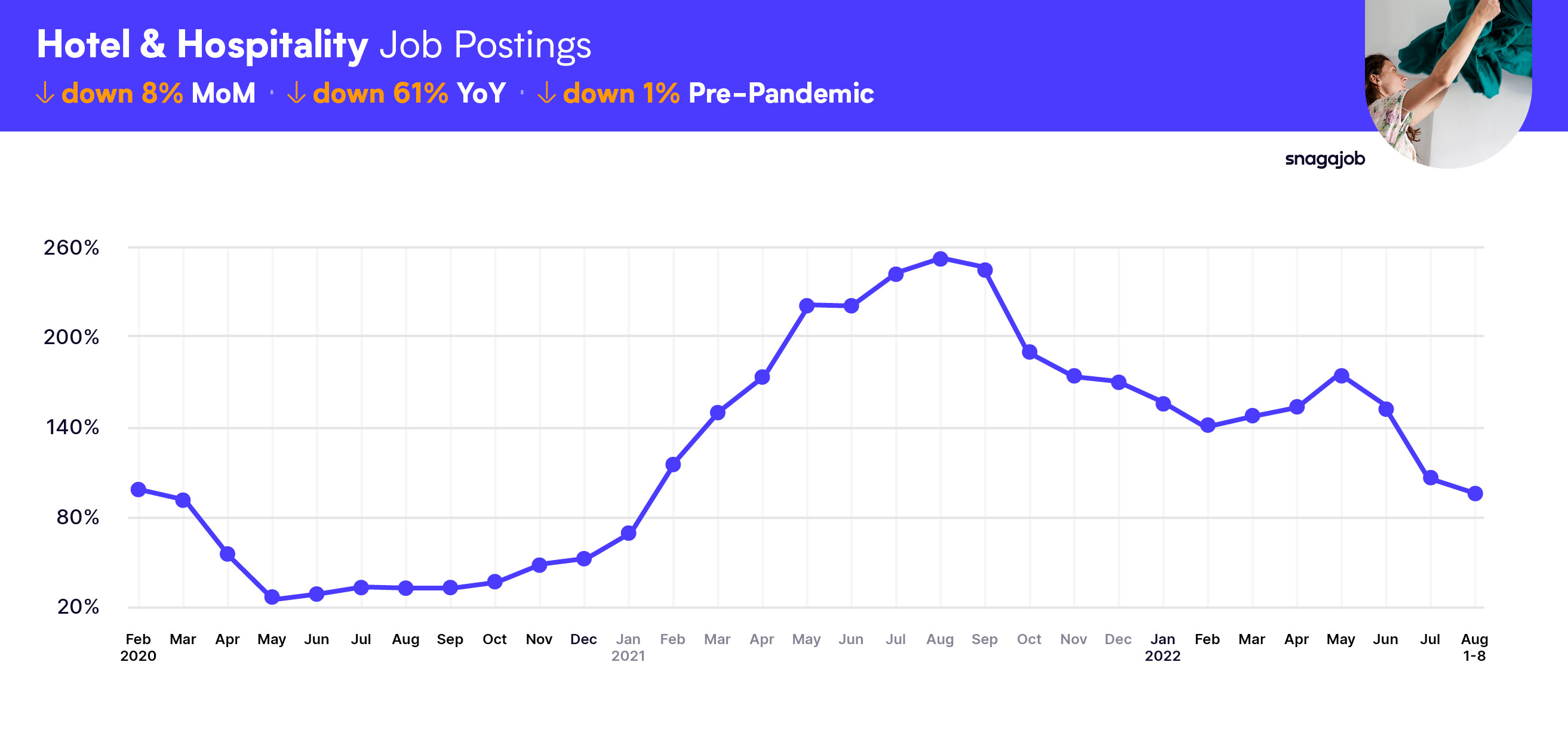 Hotel & Hospitality jobs are down 1% compared to pre-pandemic norms, seeing an 8% month-over-month drop, and a 61% year-over-year decline.