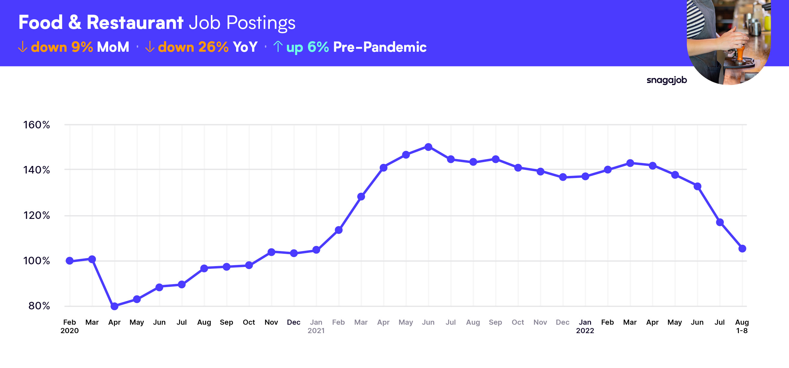 Food & Restaurant jobs are up 6% compared to pre-pandemic norms, seeing a 9% month-over-month drop, and a 26% year-over-year decline.