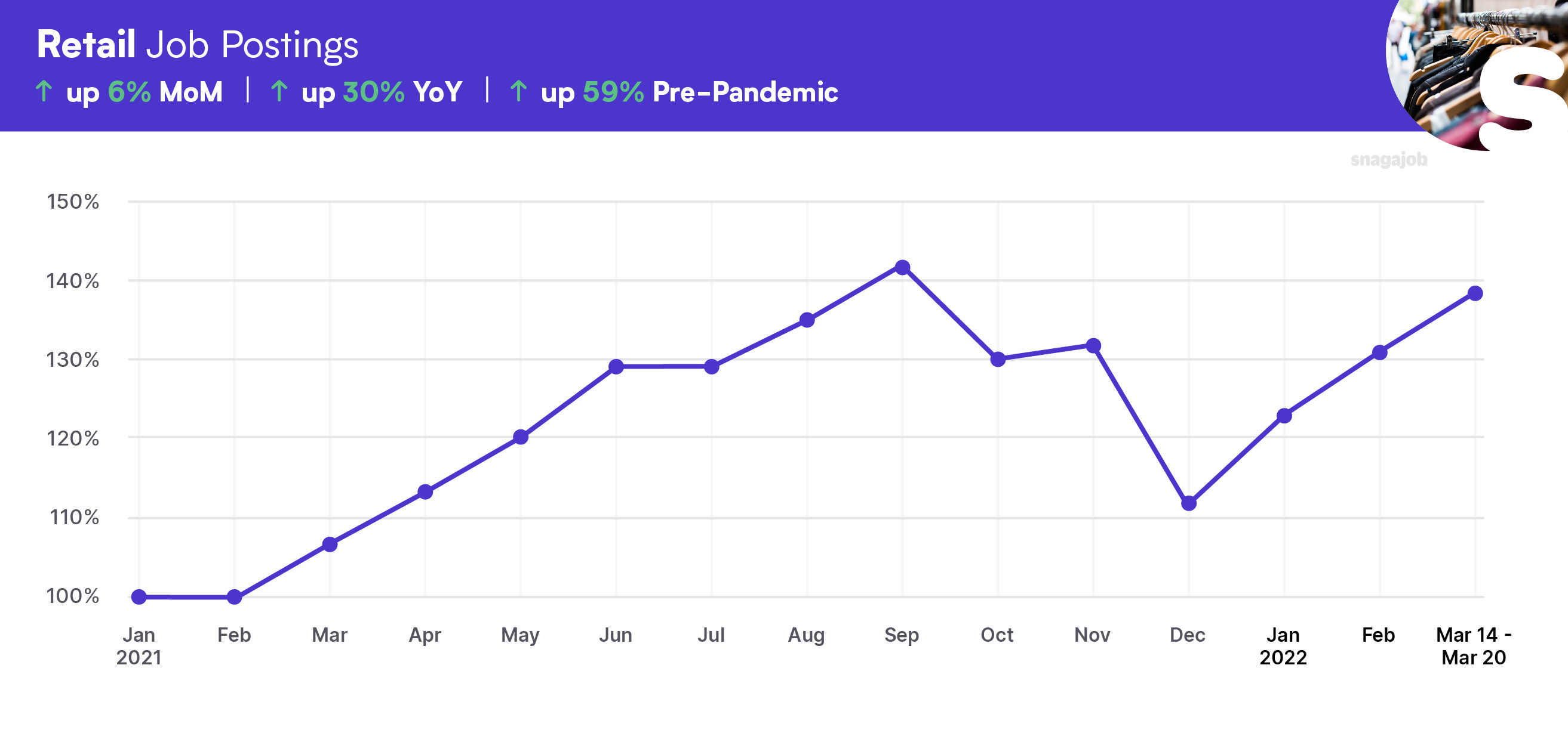 Retail jobs are up 59% compared to pre-pandemic norms, seeing a 6% month-over-month gain, and a 30% year-over-year growth.