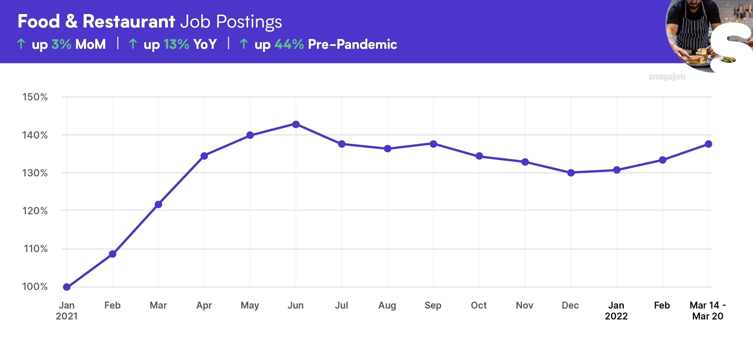 Food & Restaurant jobs are up 44% compared to pre-pandemic norms, seeing a 3% month-over-month gain, and a 13% year-over-year growth.