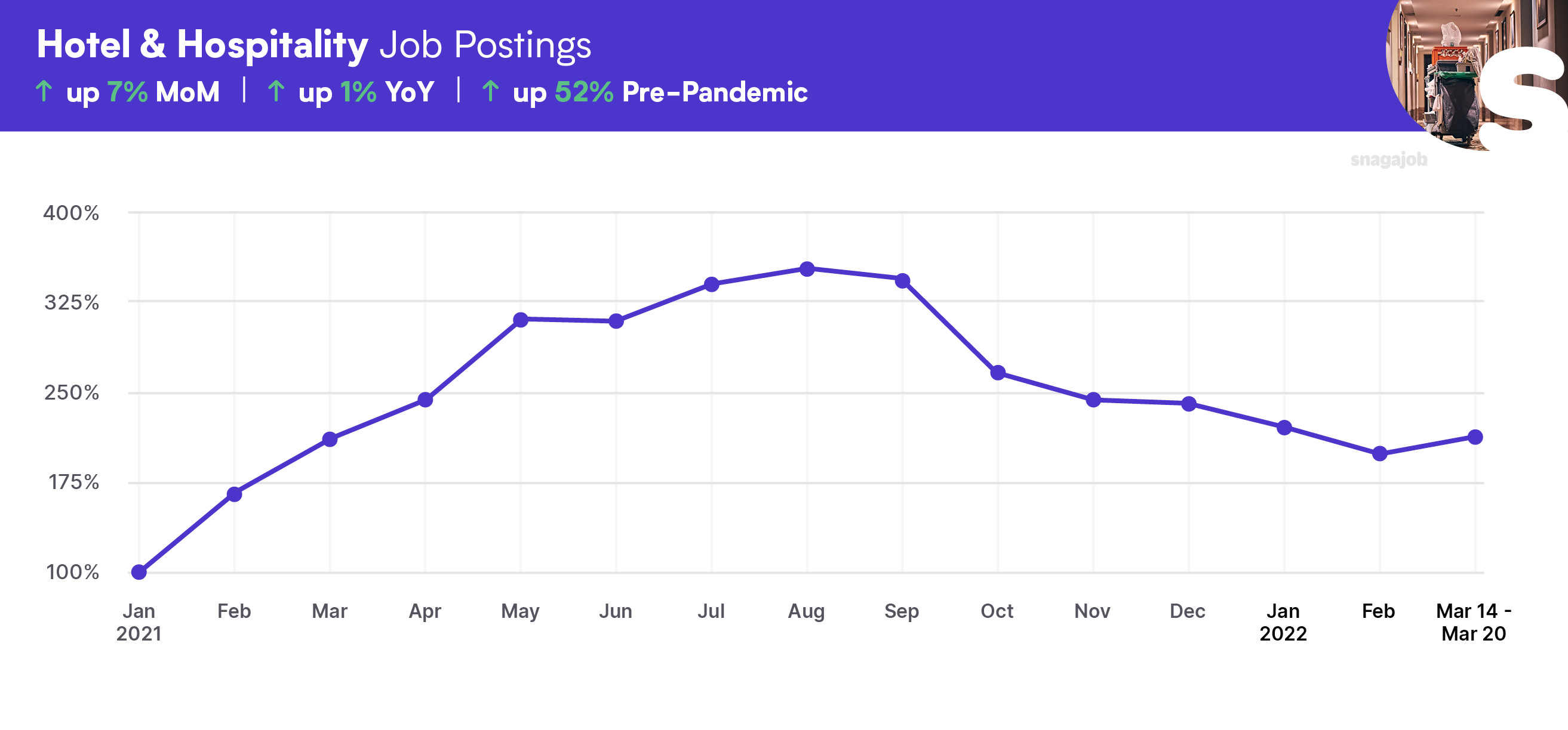 Hotel & Hospitality jobs are up 52% compared to pre-pandemic norms, seeing a 7% month-over-month gain, and a 1% year-over-year growth.