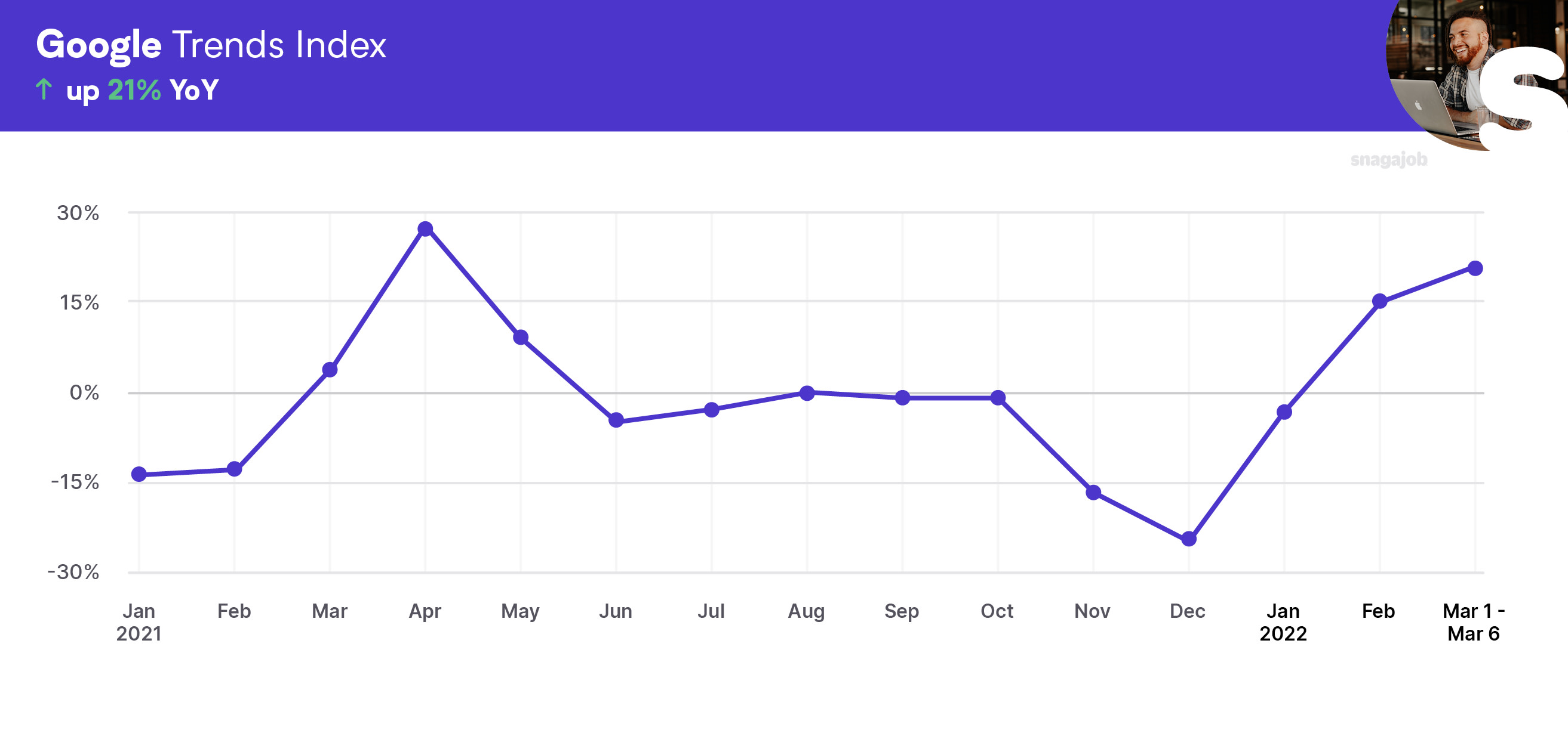 Overall, hourly jobs are up 193% compared to pre-pandemic norms, seeing a 9% month-over-month gain, and a 61% year-over-year growth. Google searches for hourly jobs are up 21% from this time last year.