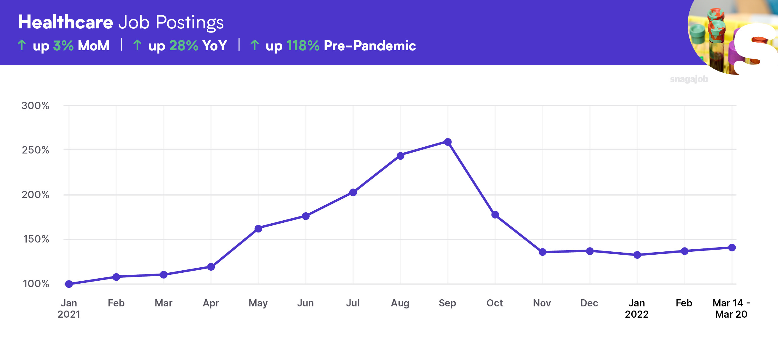 Healthcare jobs are up 118% compared to pre-pandemic norms, seeing a 3% month-over-month gain, and a 28% year-over-year growth.