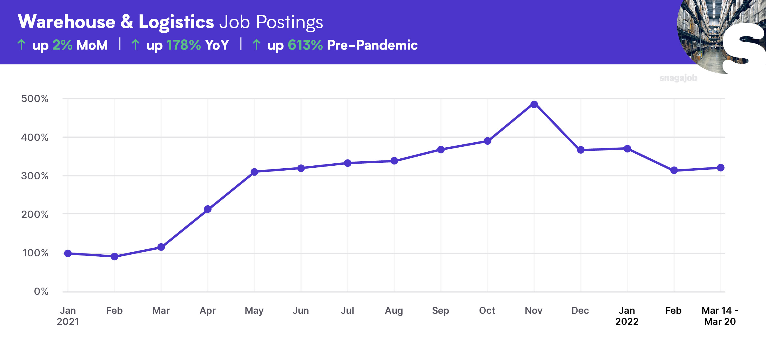 Warehouse & Logistics jobs are up 613% compared to pre-pandemic norms, seeing a 2% month-over-month gain, and a 178% year-over-year growth.