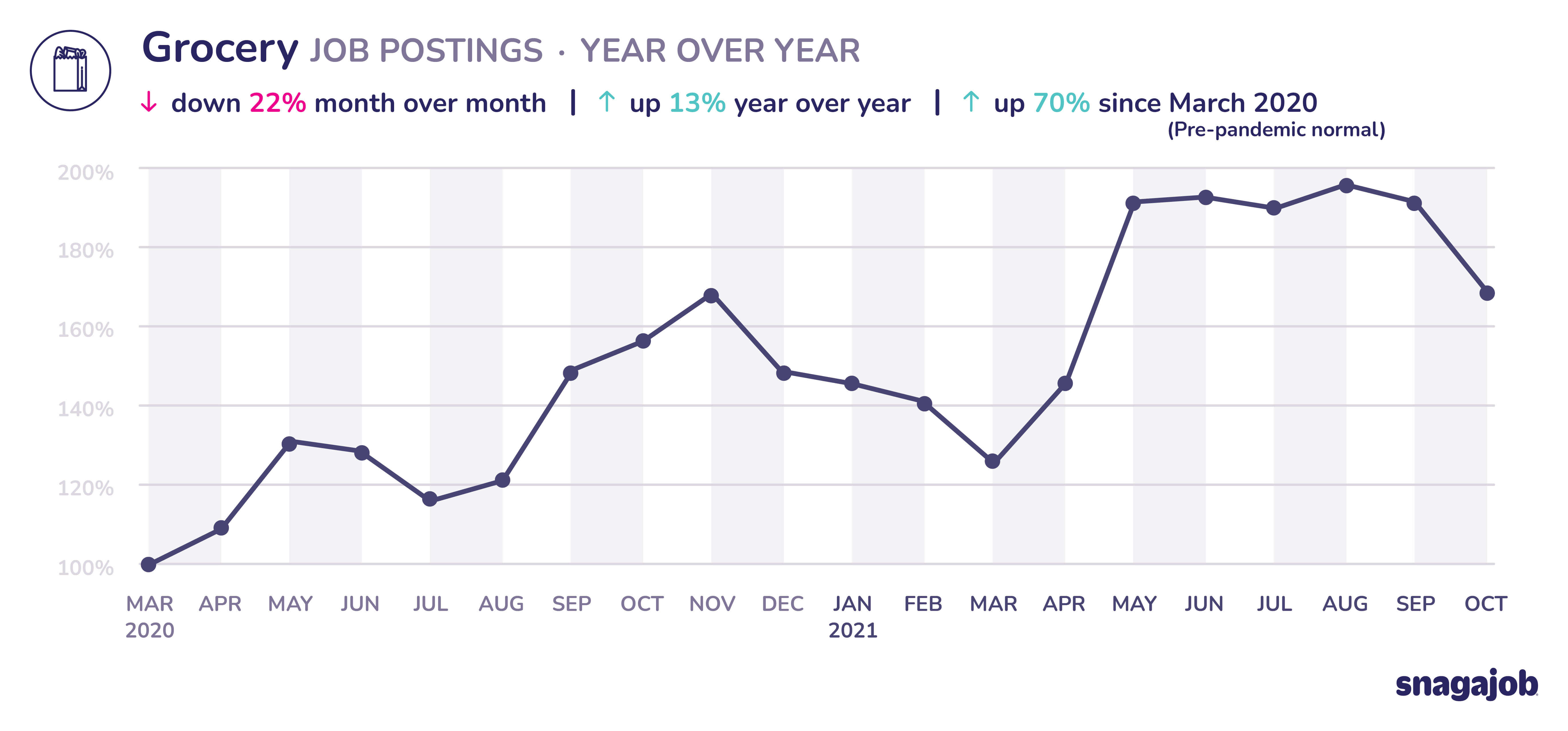 Grocery jobs are up 70% compared to pre-pandemic norms, seeing a 22% month over month decline and 13% year over year growth.