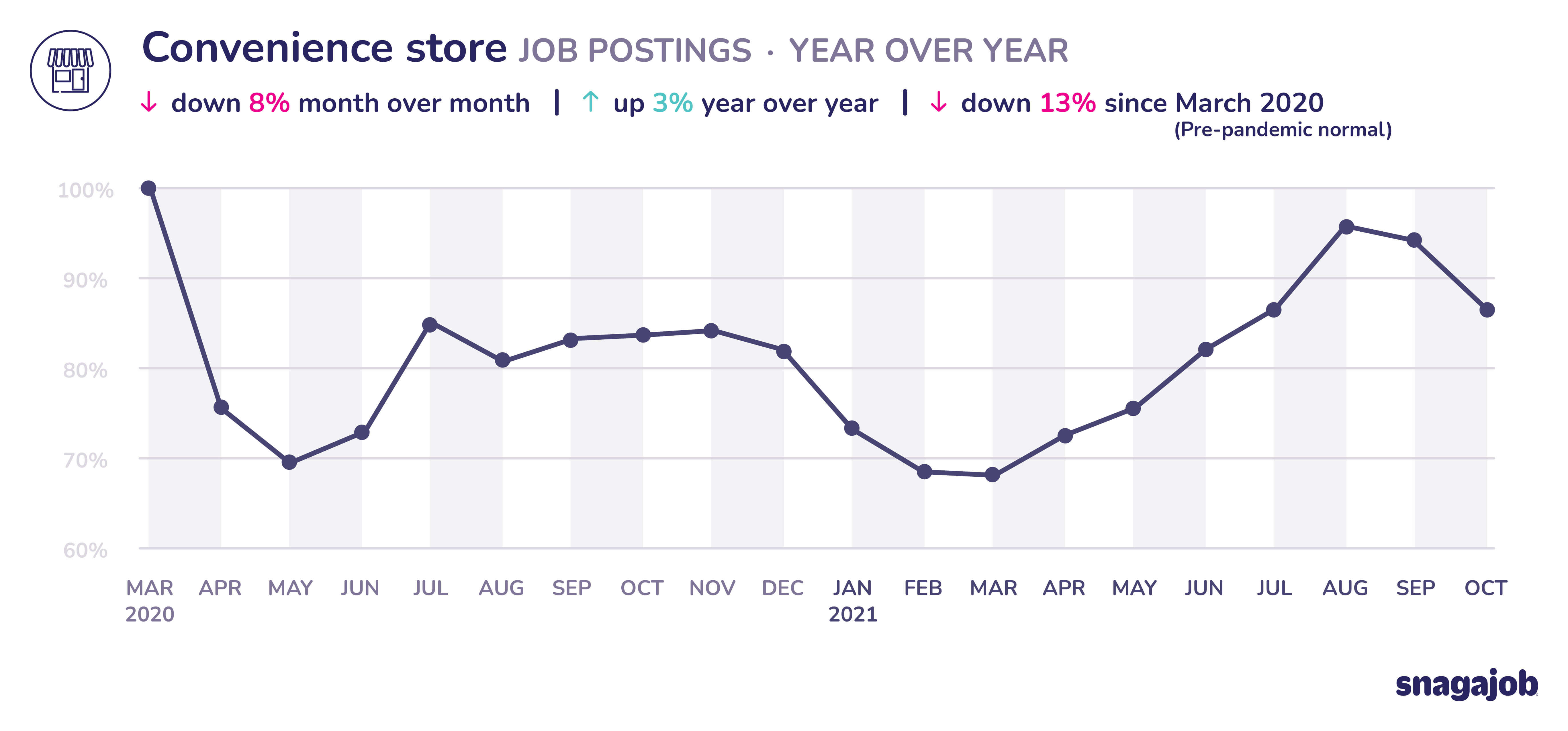 Convenience store jobs are down 13% compared to pre-pandemic norms, seeing 8% month over month decline and 3% year over year growth.