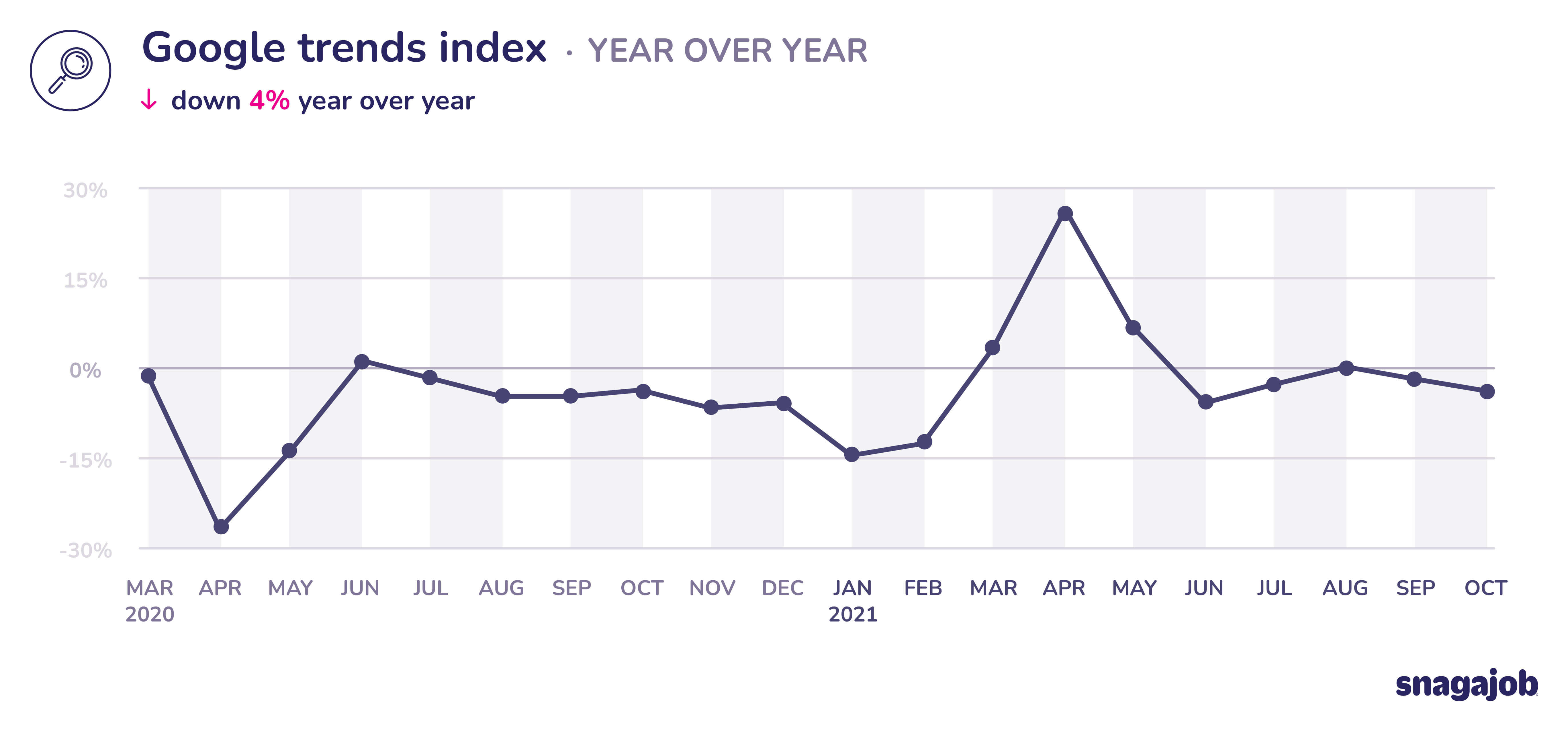 Overall jobs are up 84% compared to pre-pandemic norms, with a 15% month over month decline and 76% year over year growth. Google searches for hourly jobs are down 4% year over year.