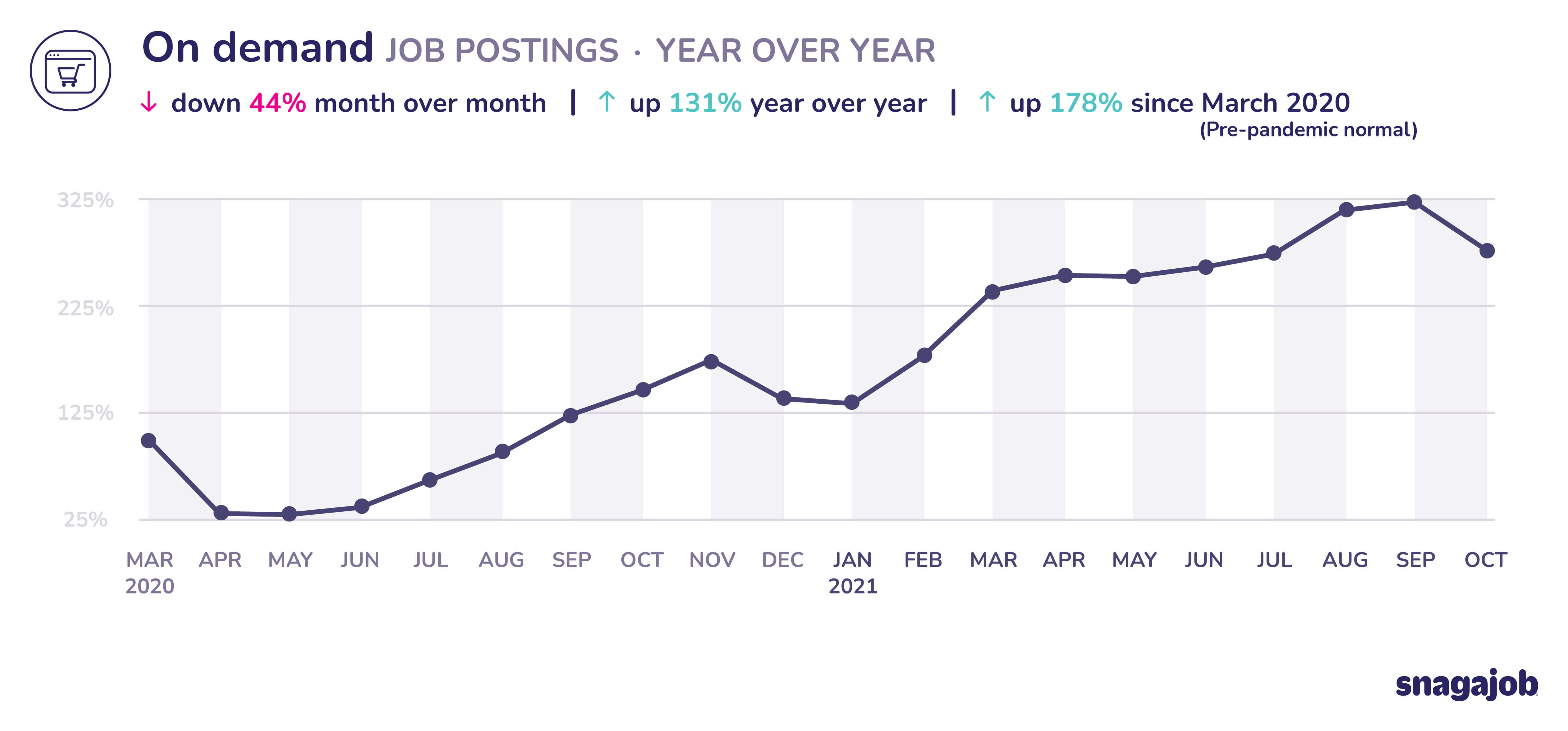 On demand jobs are up 178% compared to pre-pandemic norms, seeing a 44% month over month decline and 131% year over year growth.