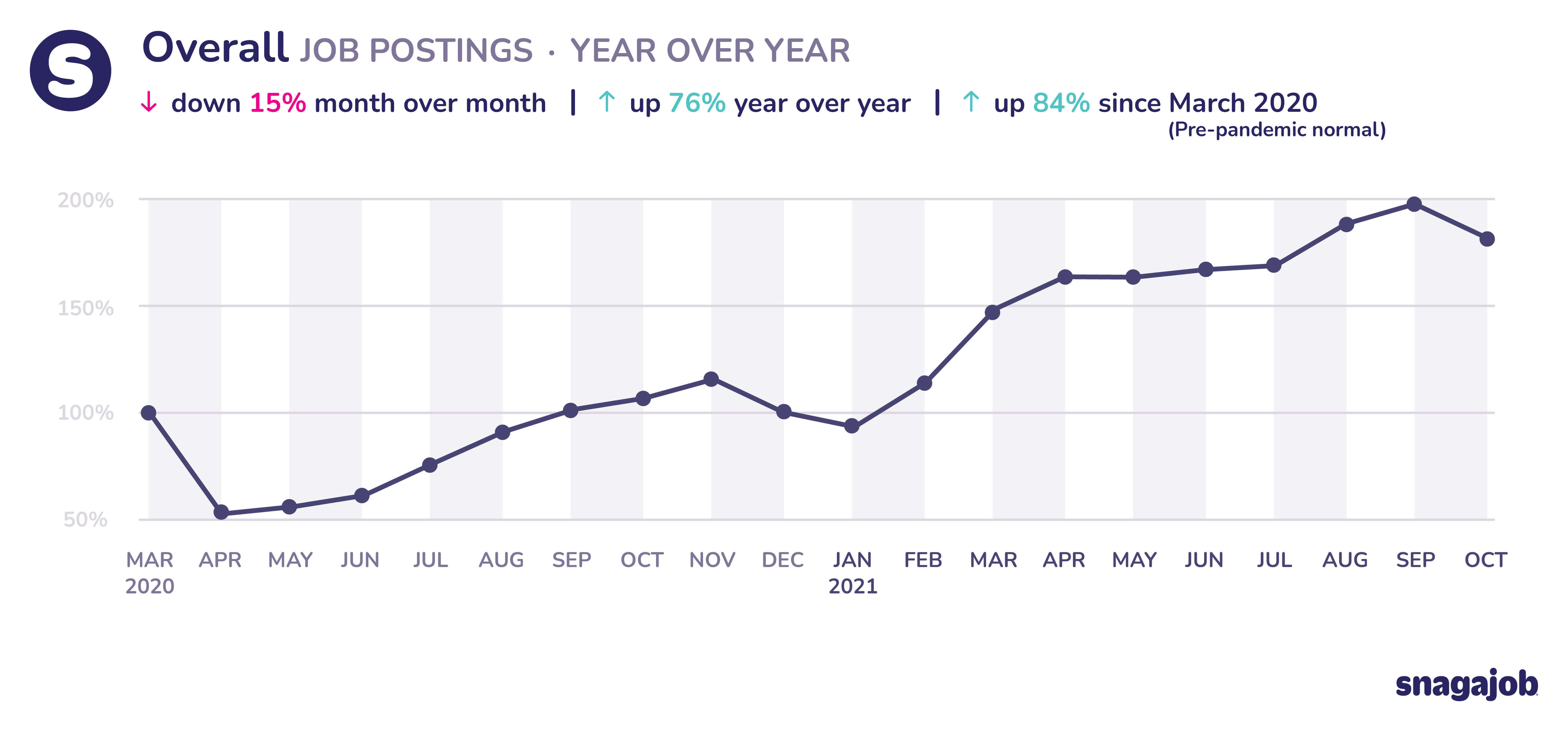 Retail jobs are up 47% compared to pre-pandemic norms, seeing 11% month over month growth and 68% year over year growth.