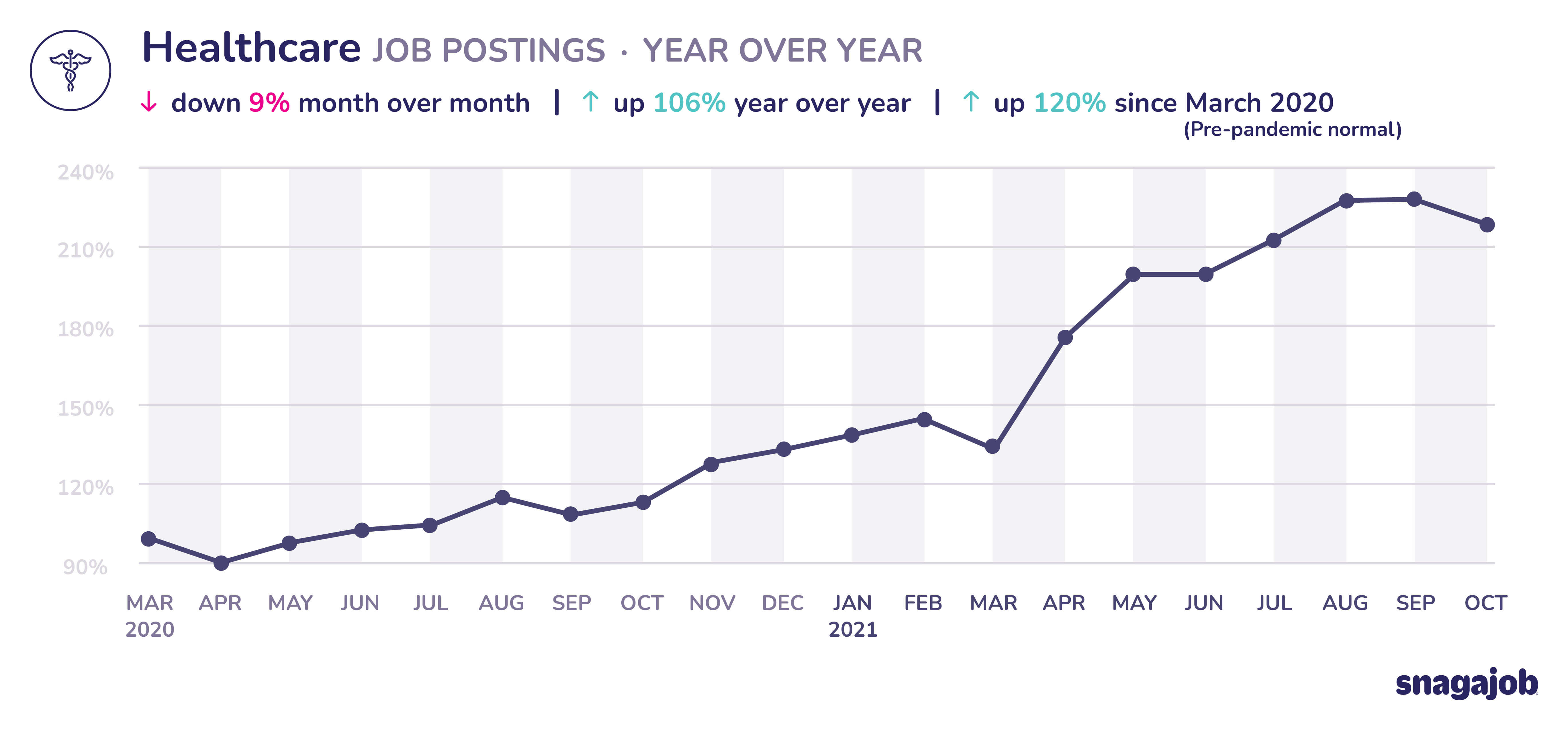 Healthcare jobs are up 120% compared to pre-pandemic norms, seeing a 9% month over month decline and 106% year over year growth.