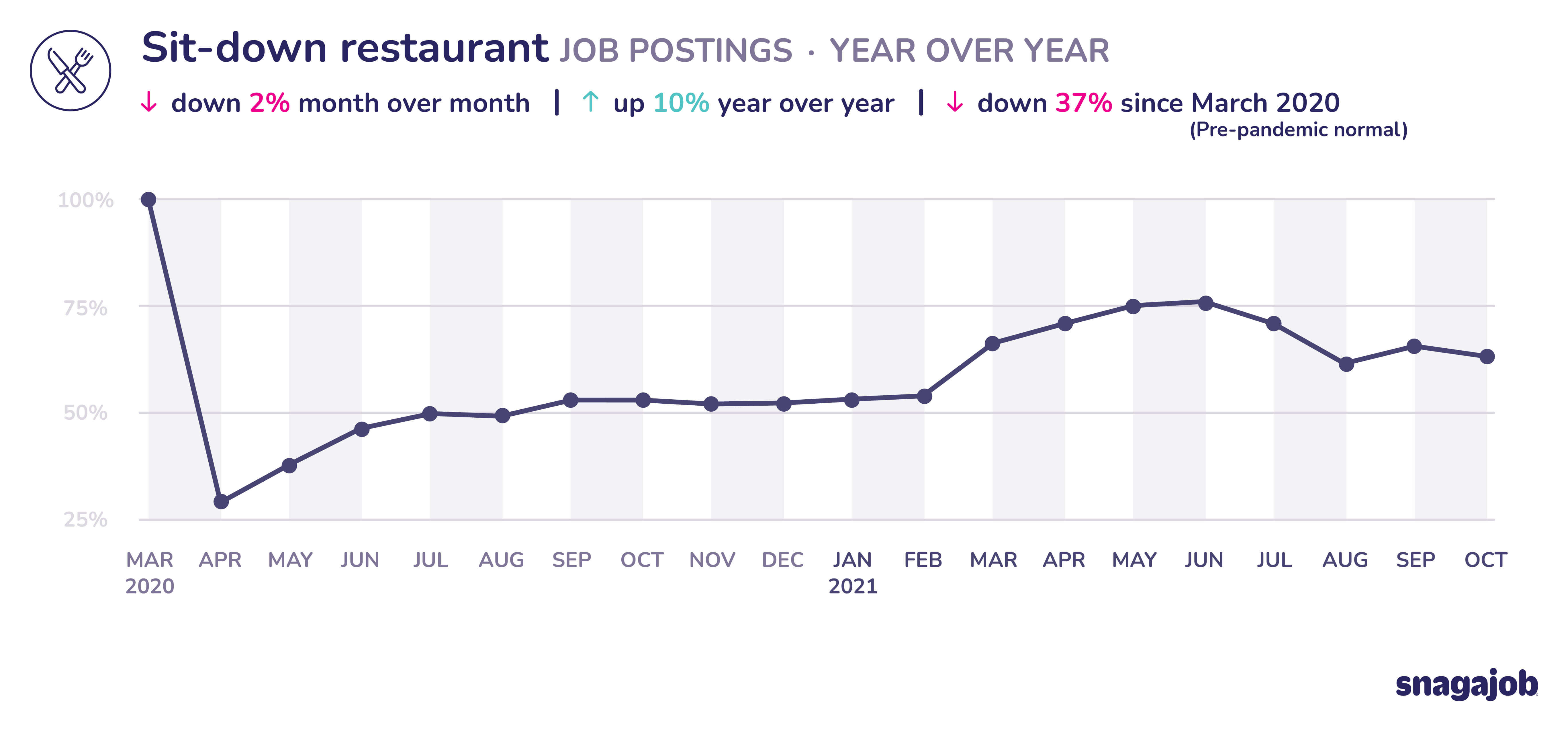 Sit-down restaurant jobs are down 37% compared to pre-pandemic norms, seeing 2% month over month decline and 10% year over year growth.
