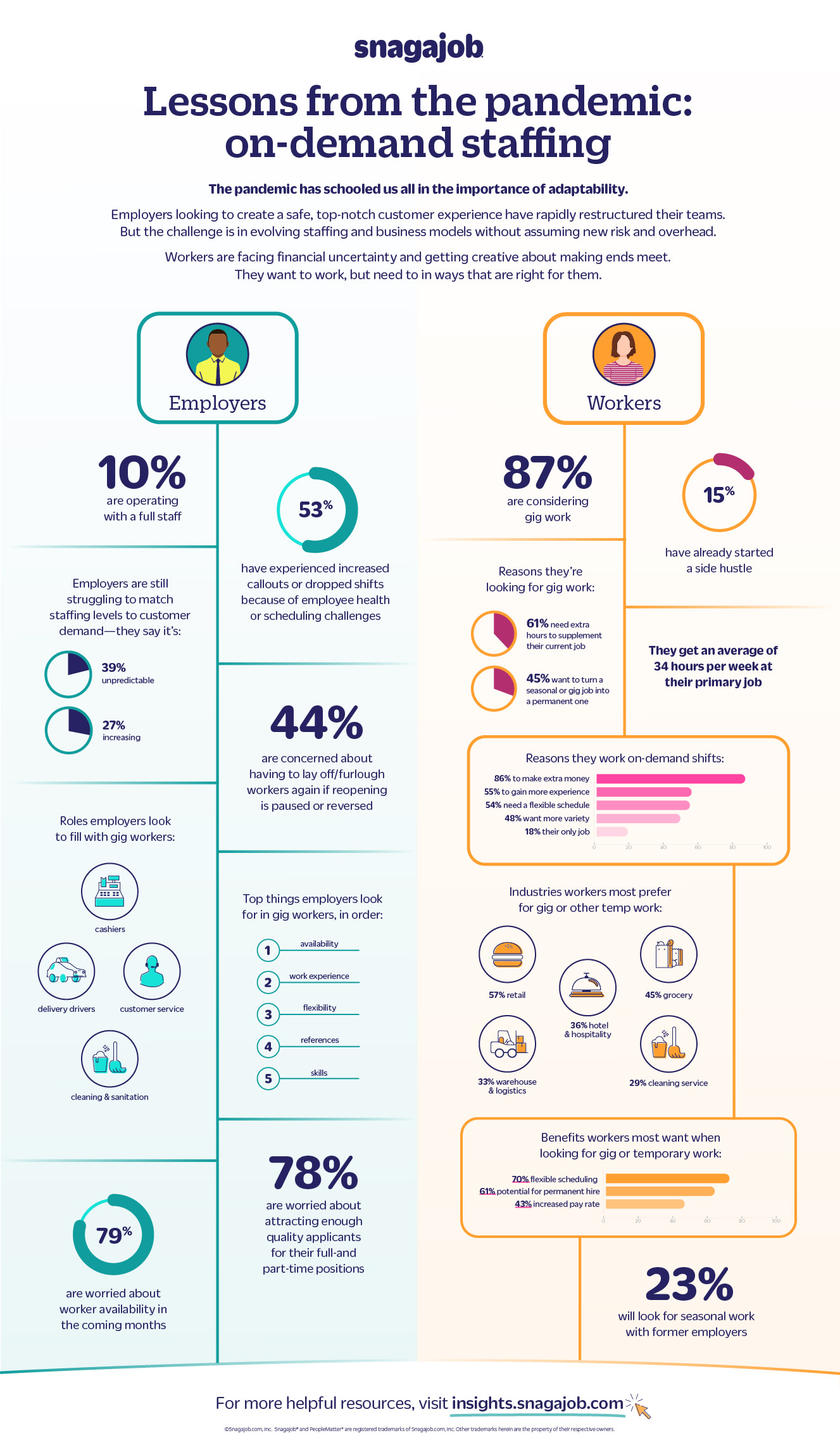 Lessons from the pandemic: on-demand staffing Emily Cox | Nov 20 Emily (she/her) leads marketing for Shifts by Snagajob, Snagajob's on-demand staffing startup. She helps employers and workers harness the power of on-demand work to improve their businesses, customer experiences and lives.