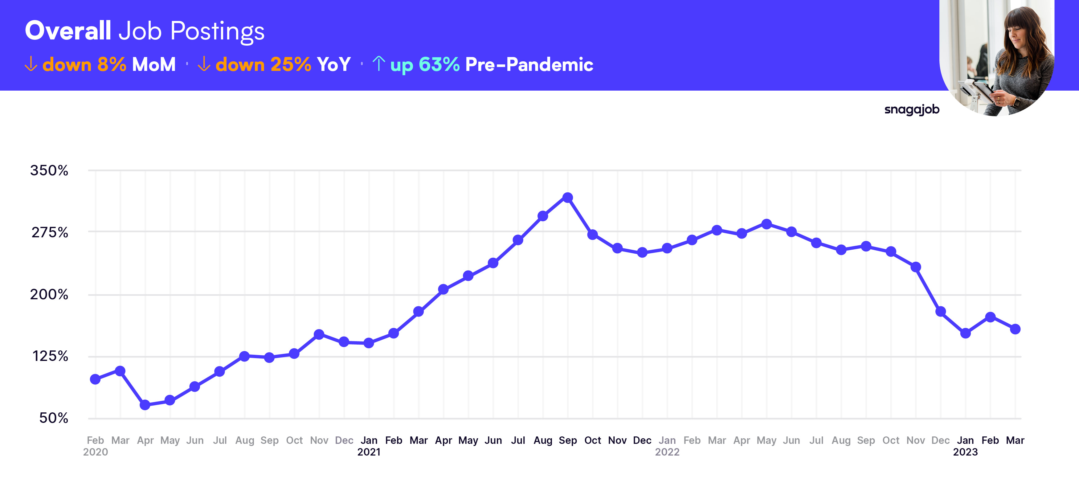 Overall hourly jobs are up 63% from February 2020's pre-pandemic numbers, and we are seeing a 8% month-over-month decline.