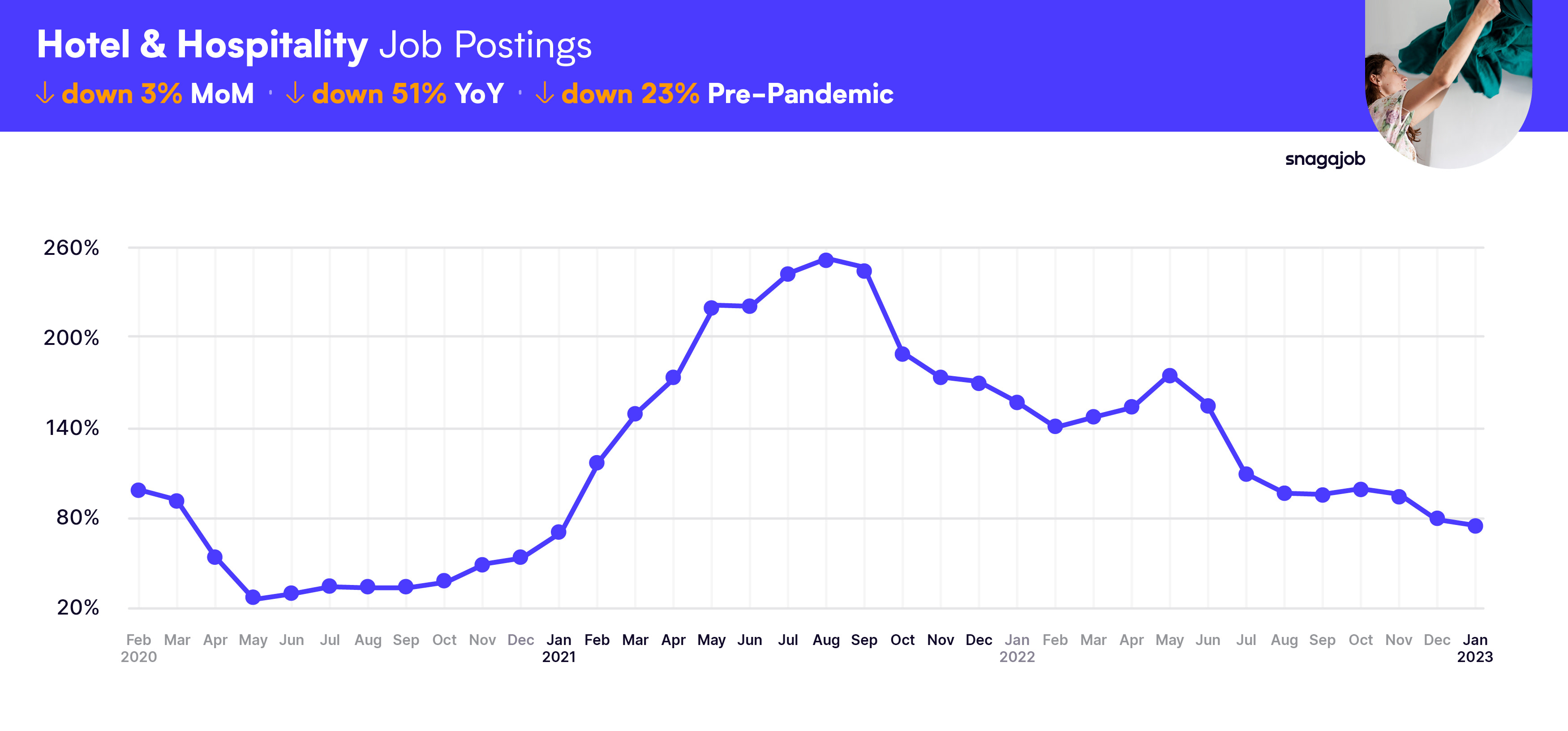 Hotel & Hospitality jobs are down 23% compared to pre-pandemic norms, seeing a 3% month-over-month drop, and a 51% year-over-year decline.