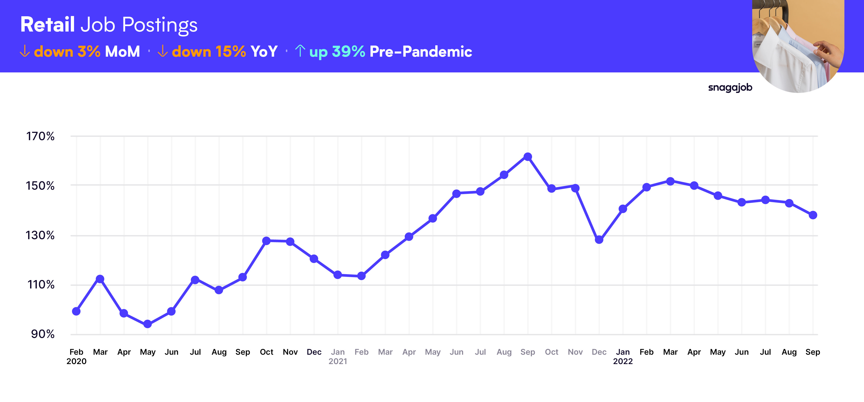 Retail jobs are up 39% compared to pre-pandemic norms, seeing a 3% month-over-month drop, and a 15% year-over-year decline.
