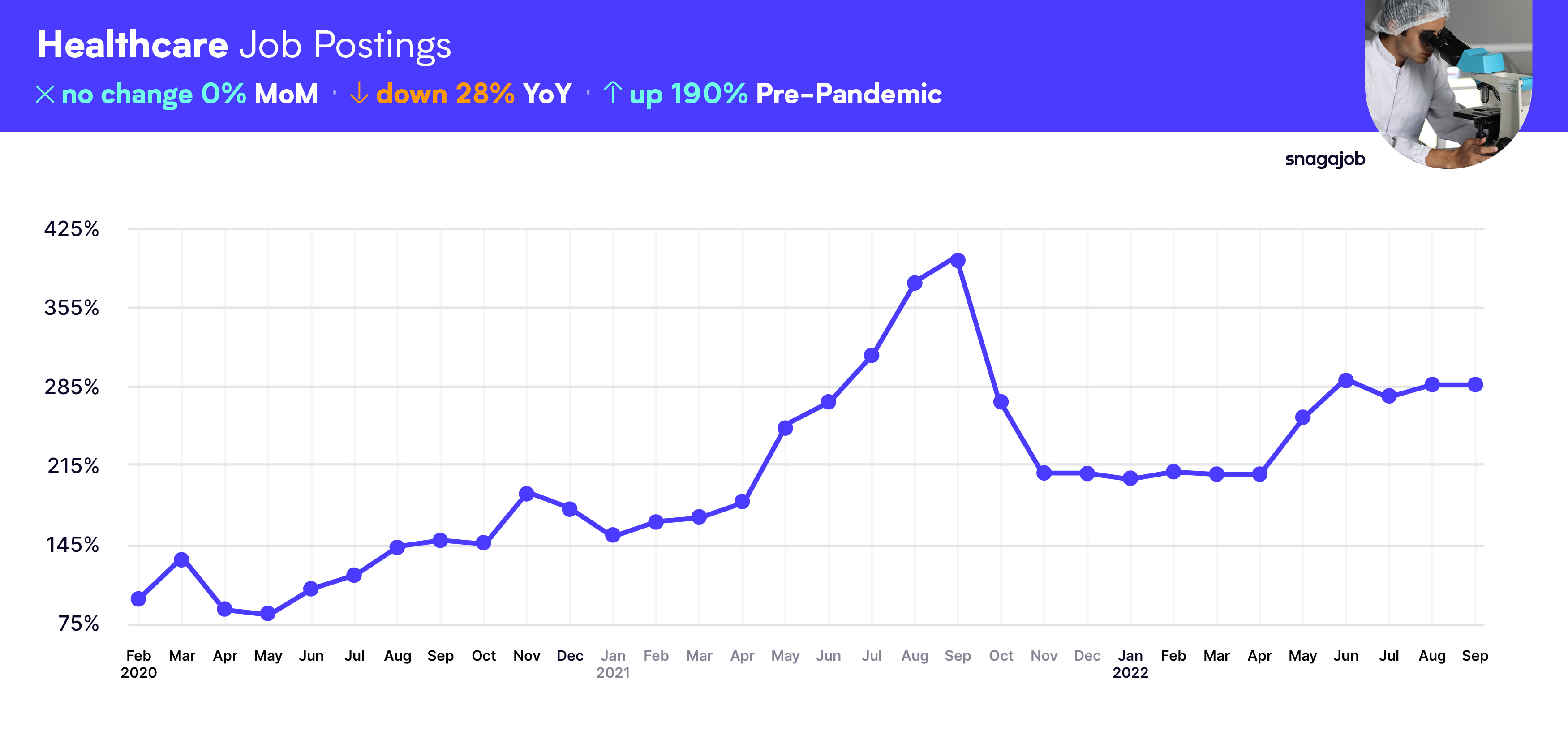 Healthcare jobs are up 190% compared to pre-pandemic norms, seeing a 0% month-over-month gain, and a 28% year-over-year decline.
