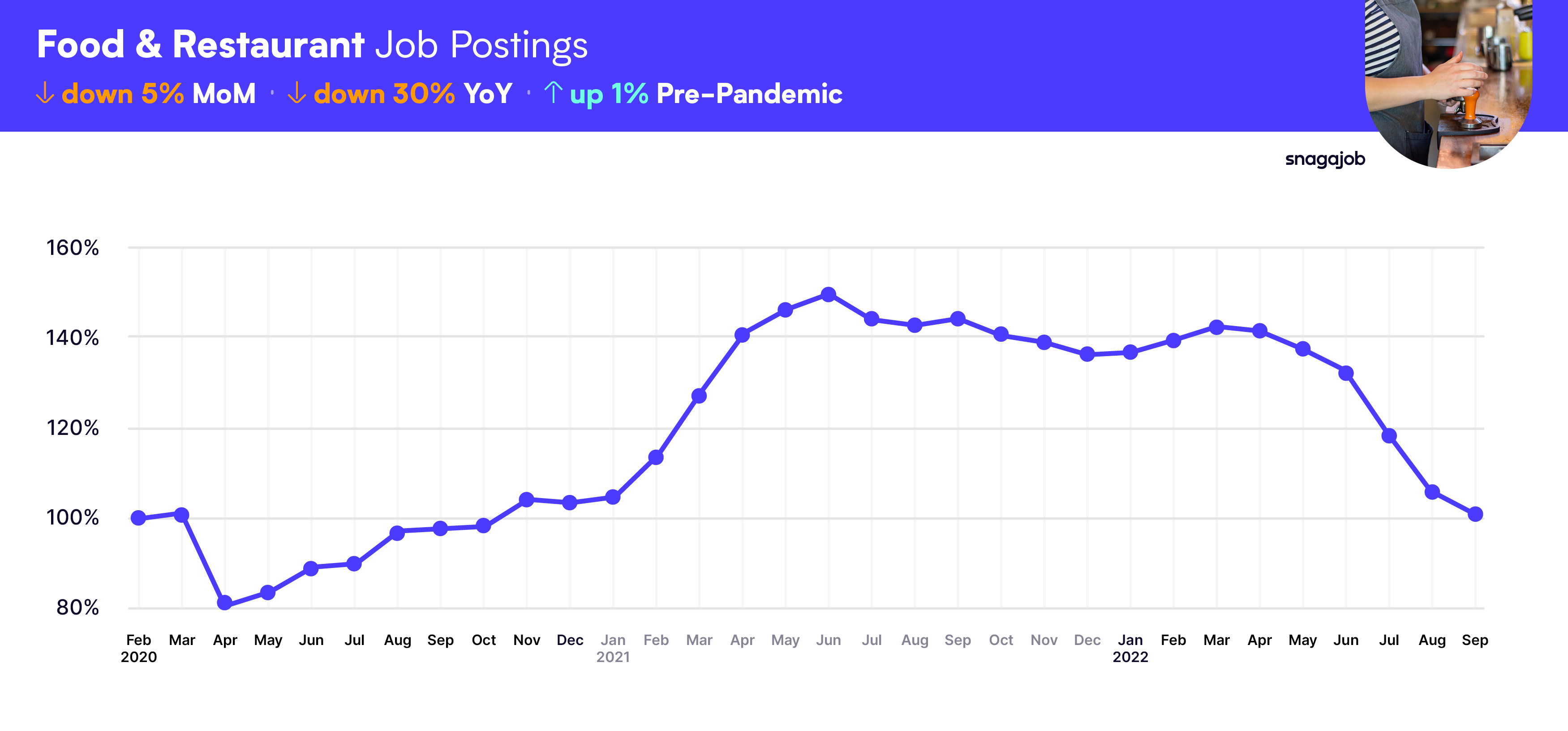 Food & Restaurant jobs are up 1% compared to pre-pandemic norms, seeing a 5% month-over-month drop, and a 30% year-over-year decline.