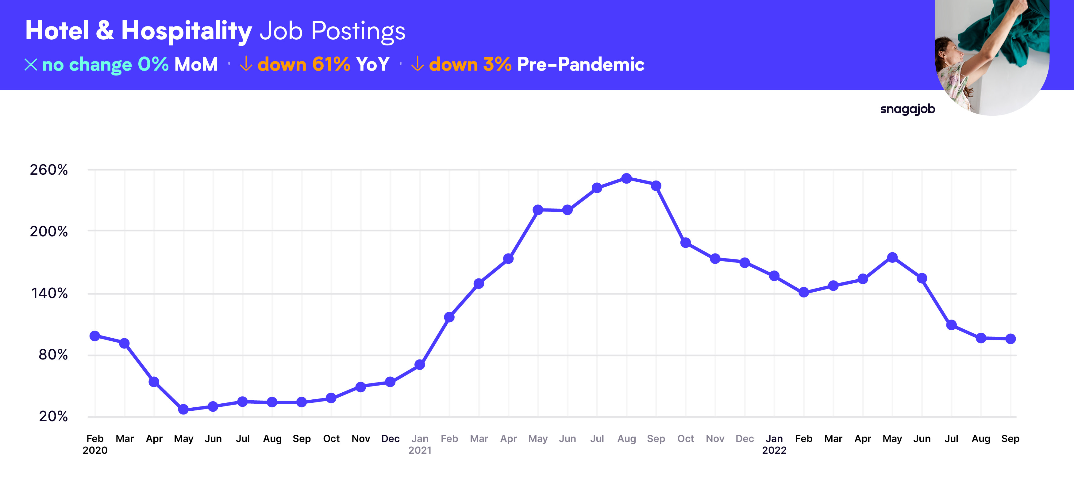 Hotel & Hospitality jobs are down 3% compared to pre-pandemic norms, seeing a 0% month-over-month gain, and a 61% year-over-year decline.
