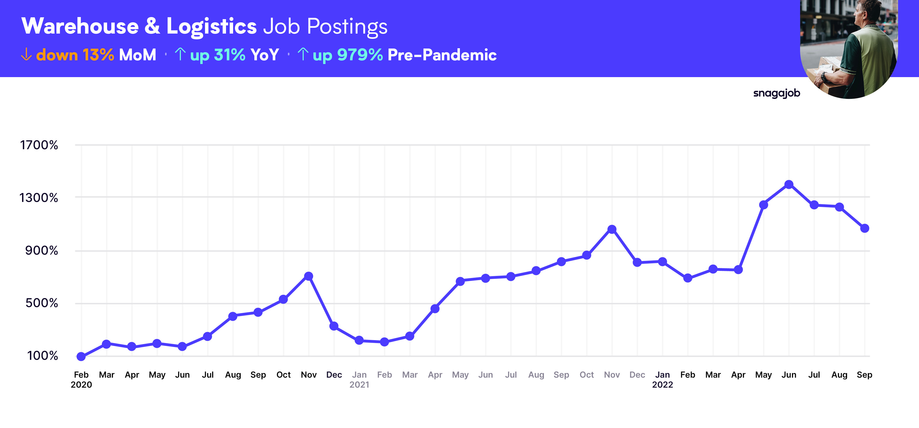Warehouse & Logistics jobs are up 979% compared to pre-pandemic norms, seeing a 13% month-over-month decline, and a 31% year-over-year growth.