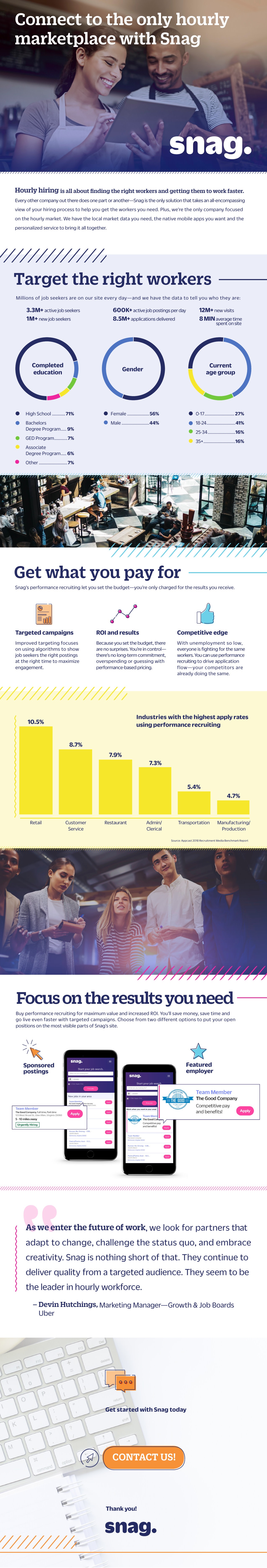 Snag Performance Recruiting Alex Woodward | Oct 11 Alex is a Growth Marketing Manager at Snagajob, where she works with sales to help connect businesses with the right workers. Her first hourly job was as a barista at Caribou Coffee.