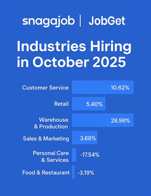 Fortunately, Snagajob and JobGet’s combined marketplace activity gives us one of the clearest real-time windows into the hourly economy. Below, we break down October’s job posting trends, highlight industries accelerating into peak season, and help employers understand where competition — and opportunity — is rising most.