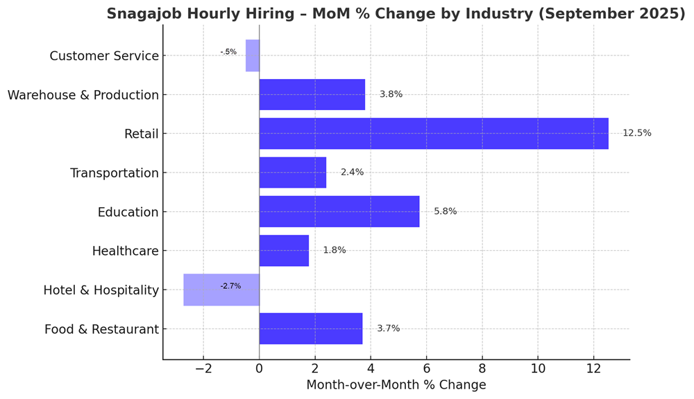 With the U.S. government shutdown delaying the Bureau of Labor Statistics’ monthly report release, Snagajob’s job posting data provides one of the clearest windows into the state of the hourly labor market. September’s hiring data from Snagajob shows a highly uneven but opportunity-rich hourly labor market as we enter the holiday hiring season. Retail, warehouse and production and transportation rebounded and education remained strong, while hospitality and customer service hiring cooled.