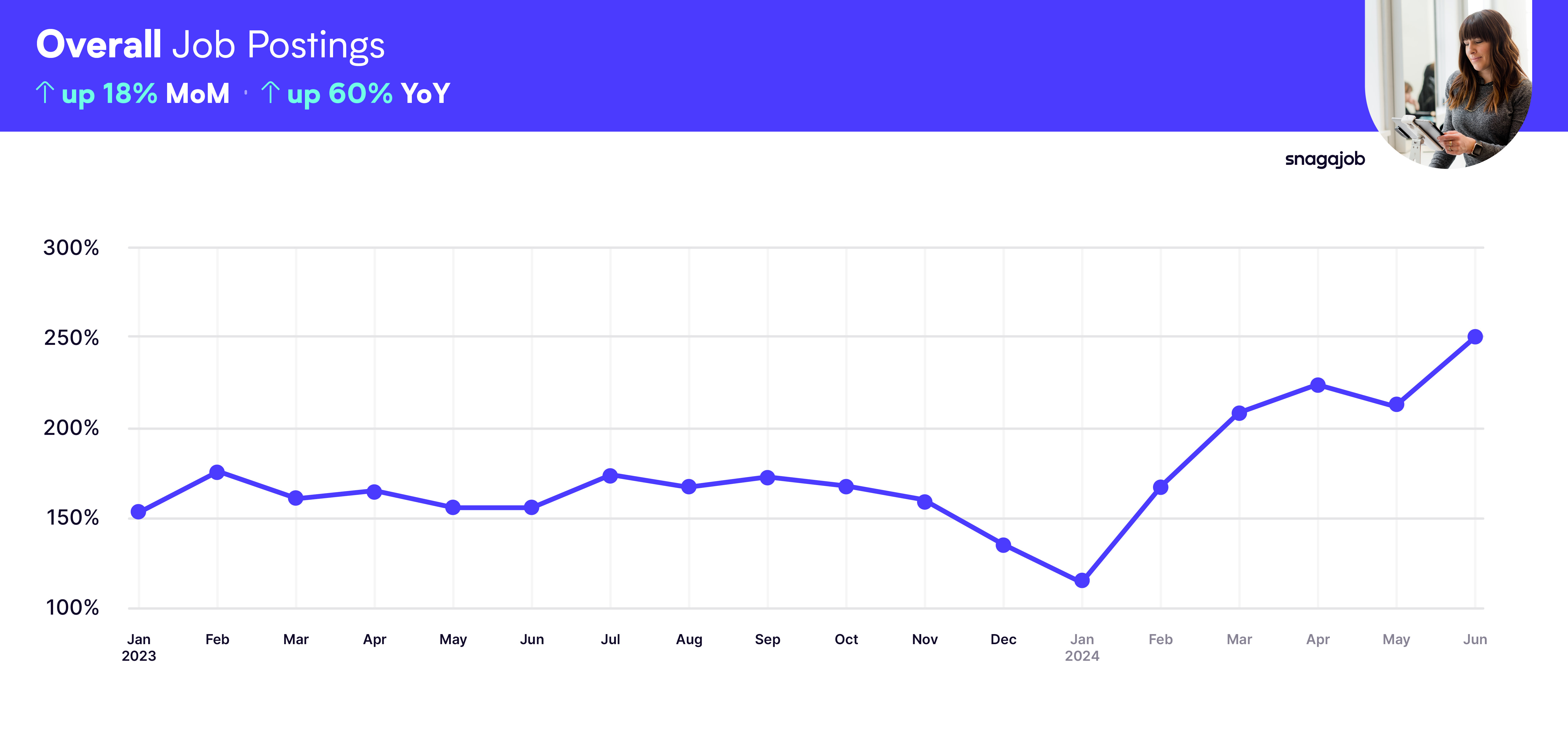 On Snagajob, overall job postings are up 18% month over month and up 60% year over year, with notable gains in the Retail (+18%), Education (+16%), Automotive (+11%), Management (+39%) and Healthcare (+17%) industries.