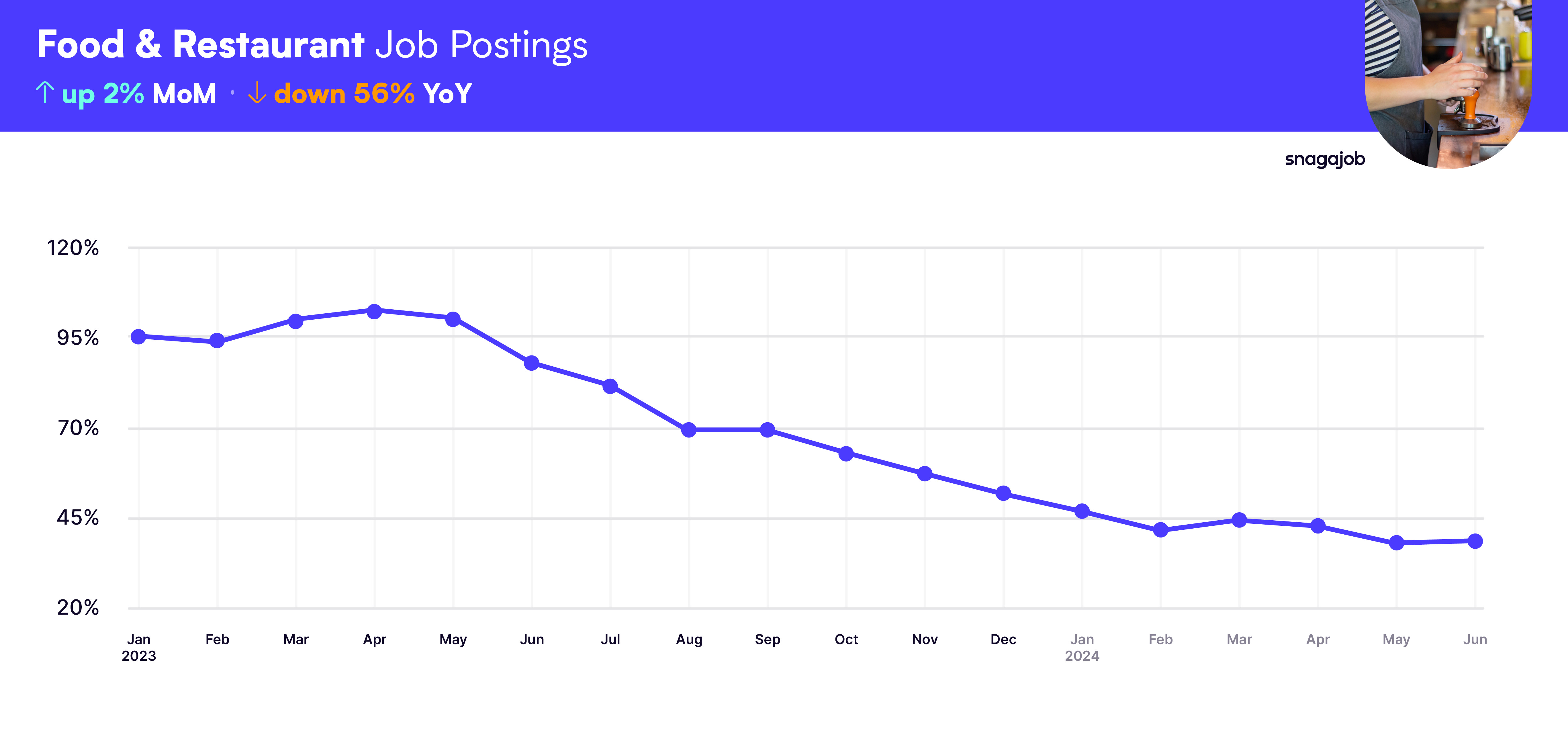 Food & Restaurant jobs are up 2% month-over-month.