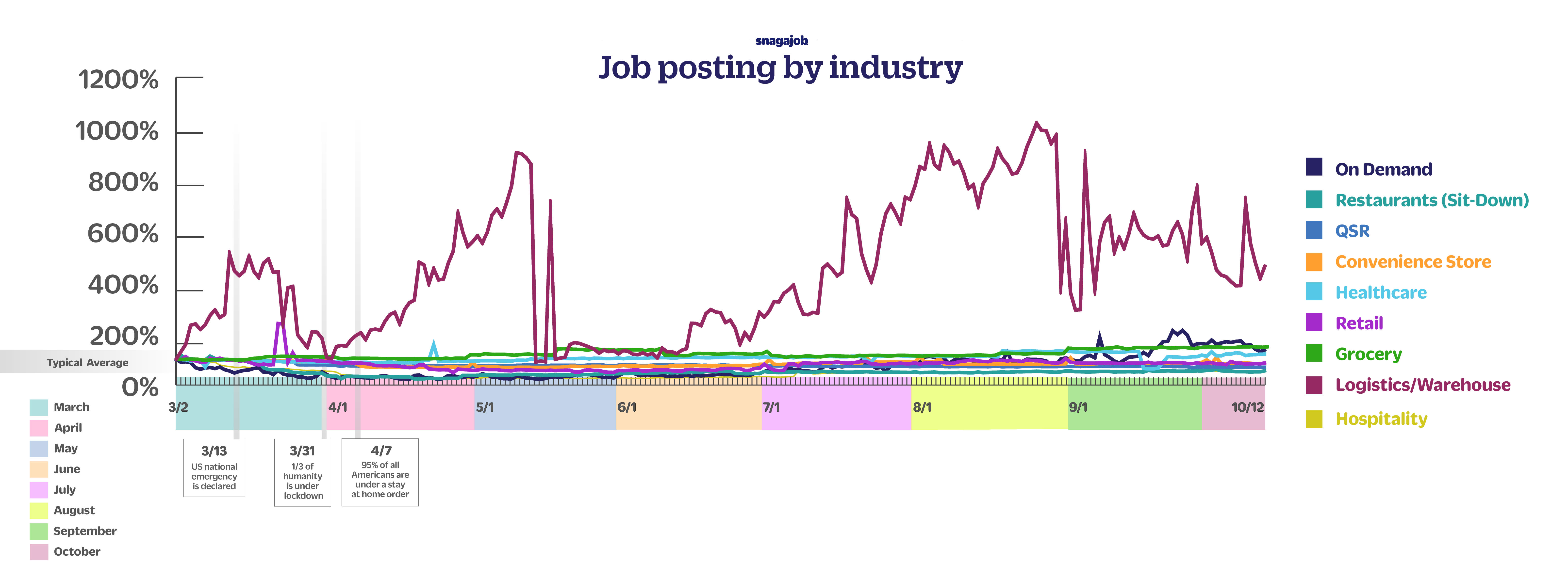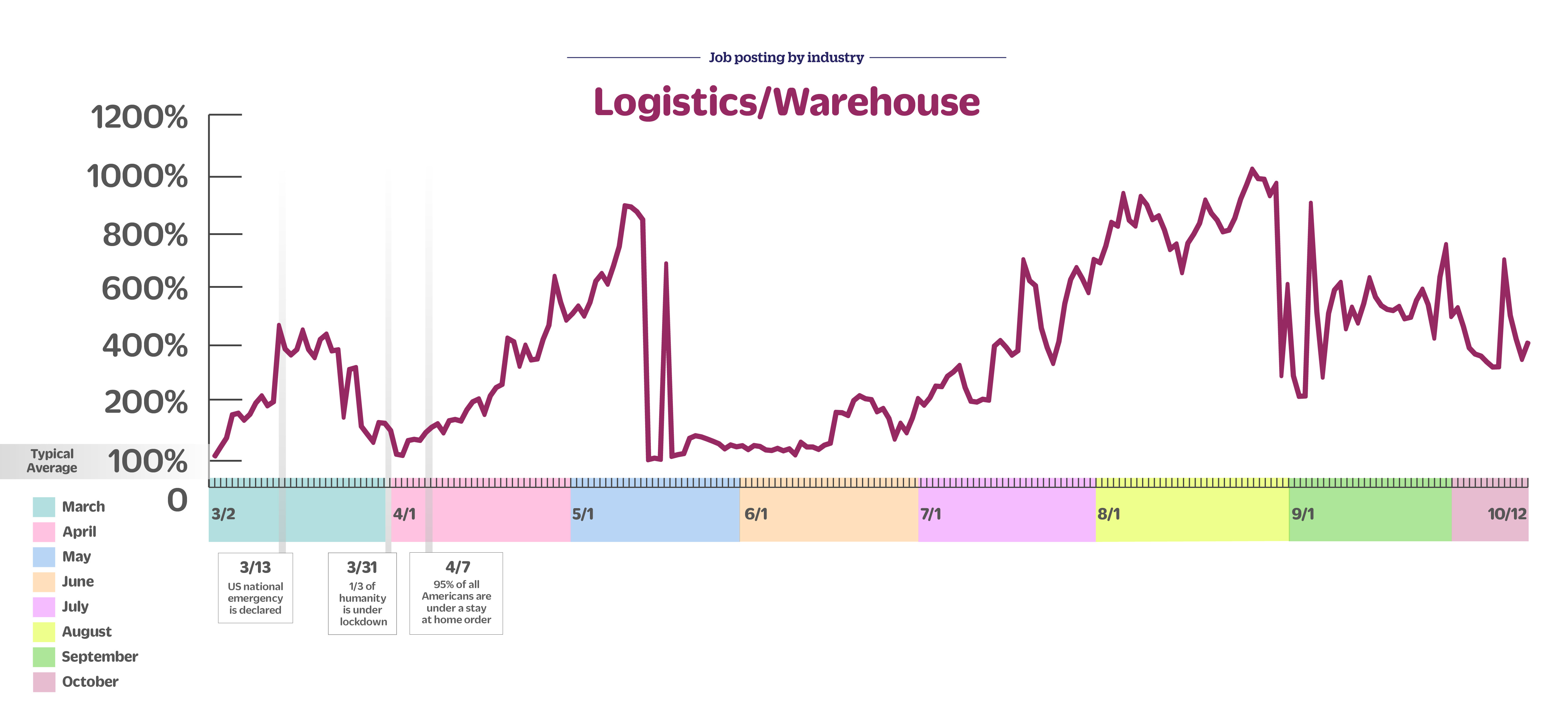 Logistics and warehouse jobs are up 62% week over week, down 110% month over month and up 366% since early March.