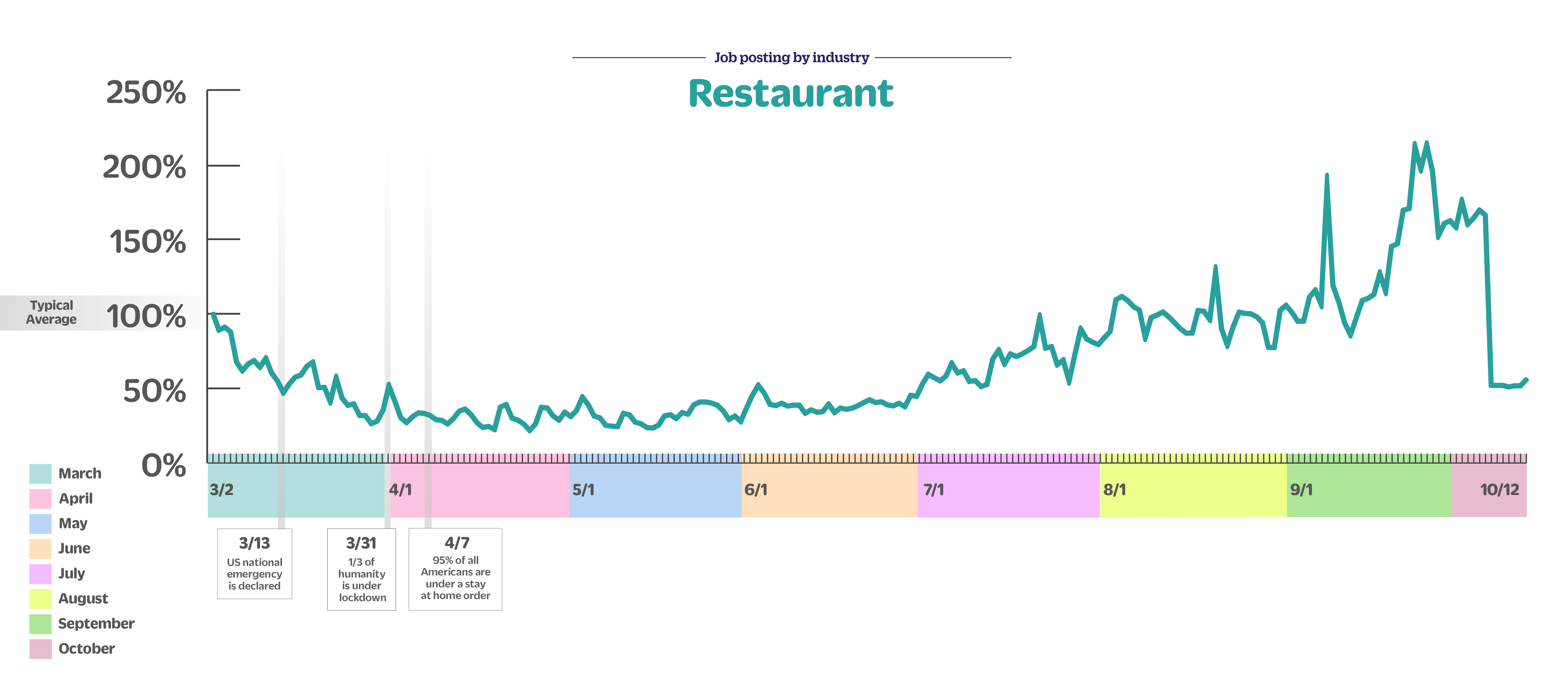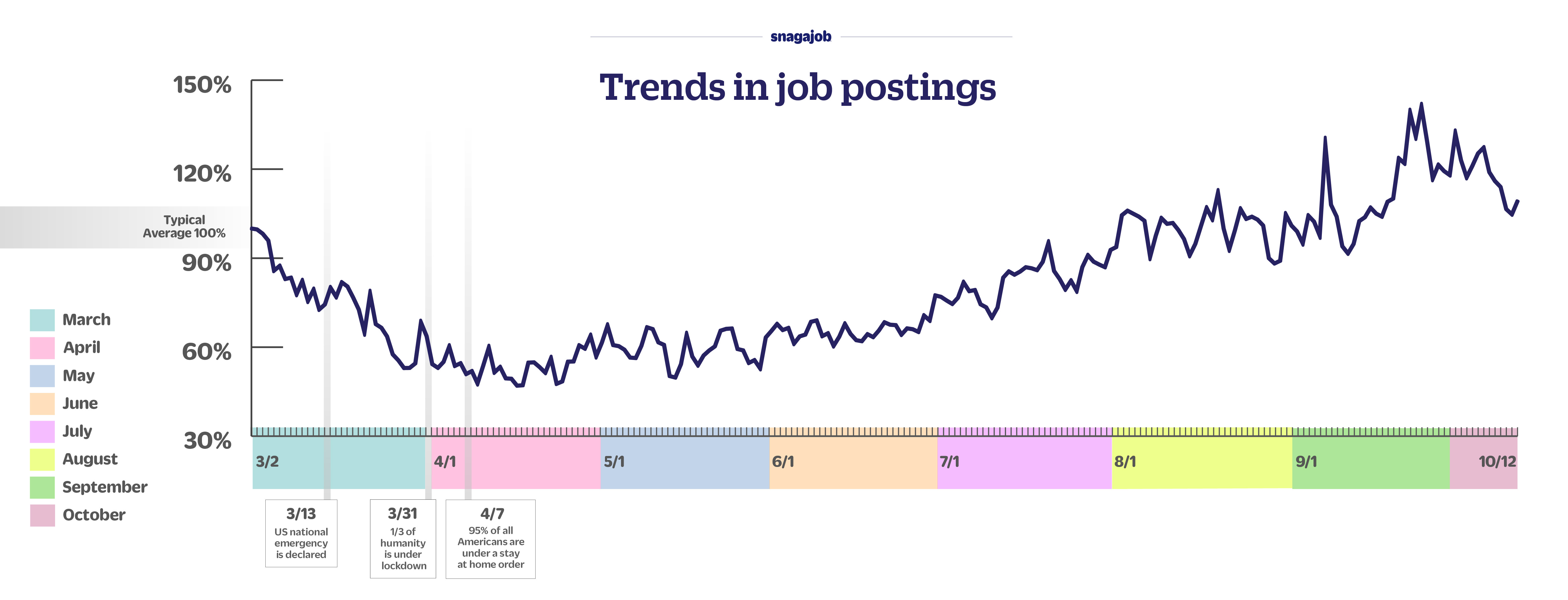 Snagajob is here to help you navigate the hourly hiring landscape during this pandemic. Our proprietary data gives us a unique perspective on hourly job trends and we can see how both workers and employers are responding in real-time. One of the most valuable things we can offer you is a view into these insights and hiring trends. We’re here to give you helpful context as you make business decisions.