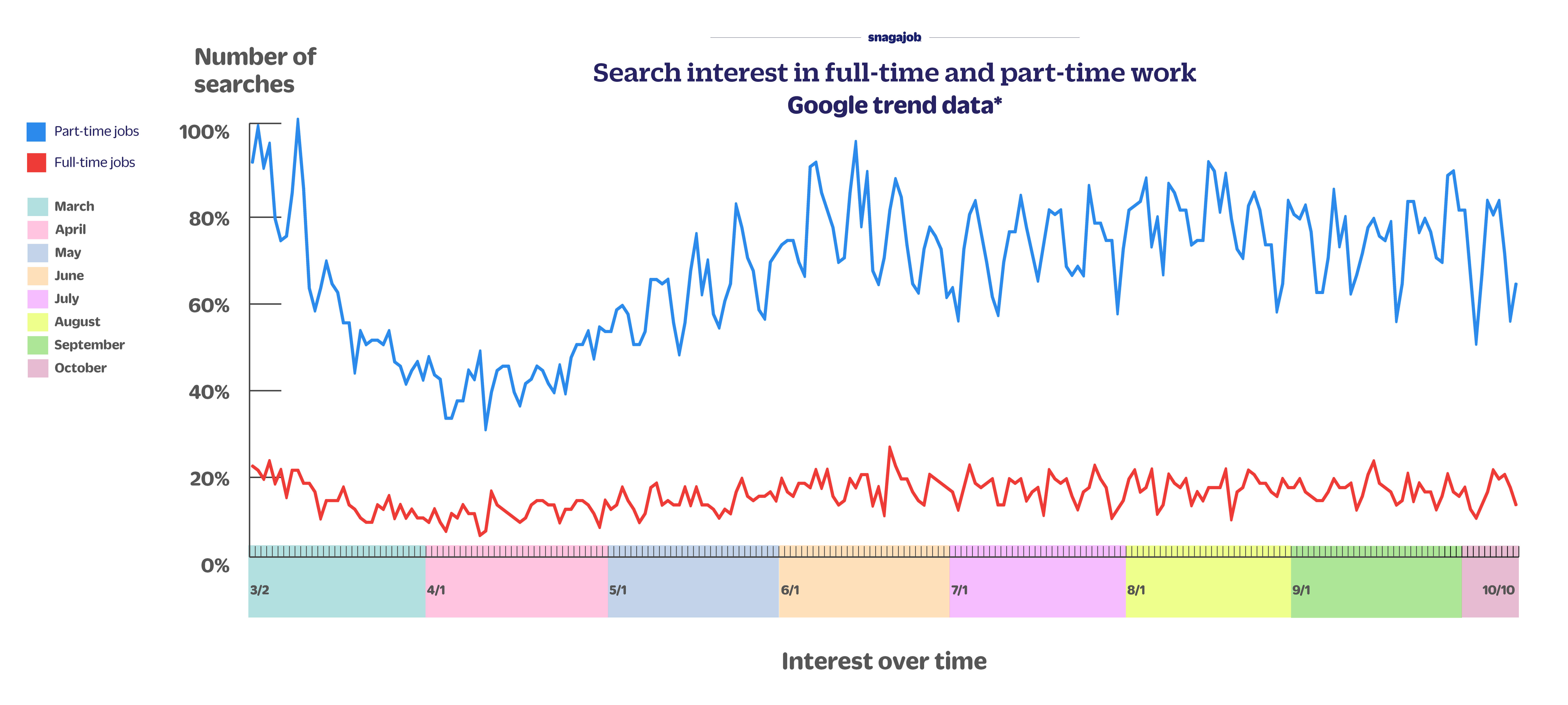 Google searches for part-time jobs are up 13% week over week, down 15% month over month and down 28% since early March.