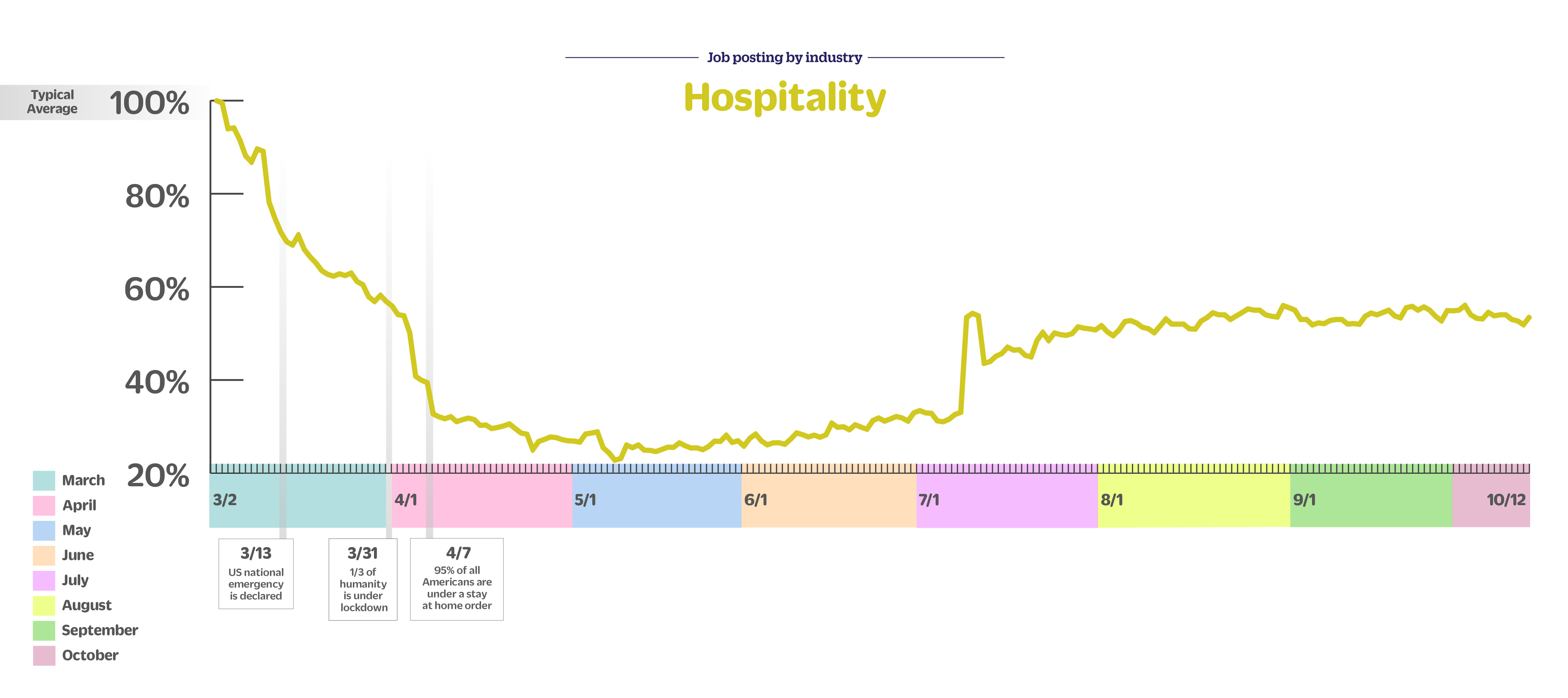 Hospitality jobs are down 1% week over week, up 1% month over month and down 46% since early March.