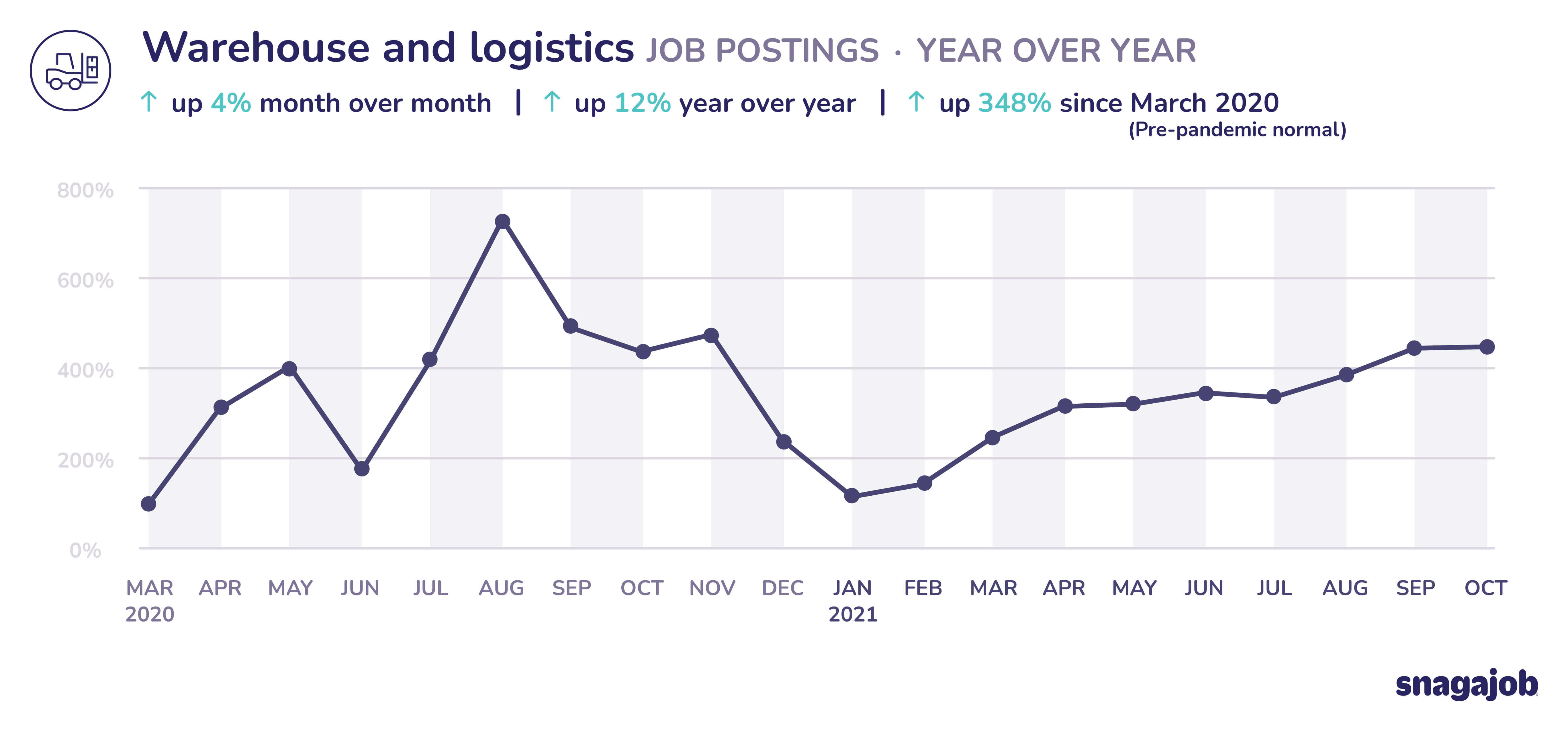 Warehouse and logistics jobs are up 348% compared to pre-pandemic norms, seeing 4% month over month growth and 12% year over year growth.