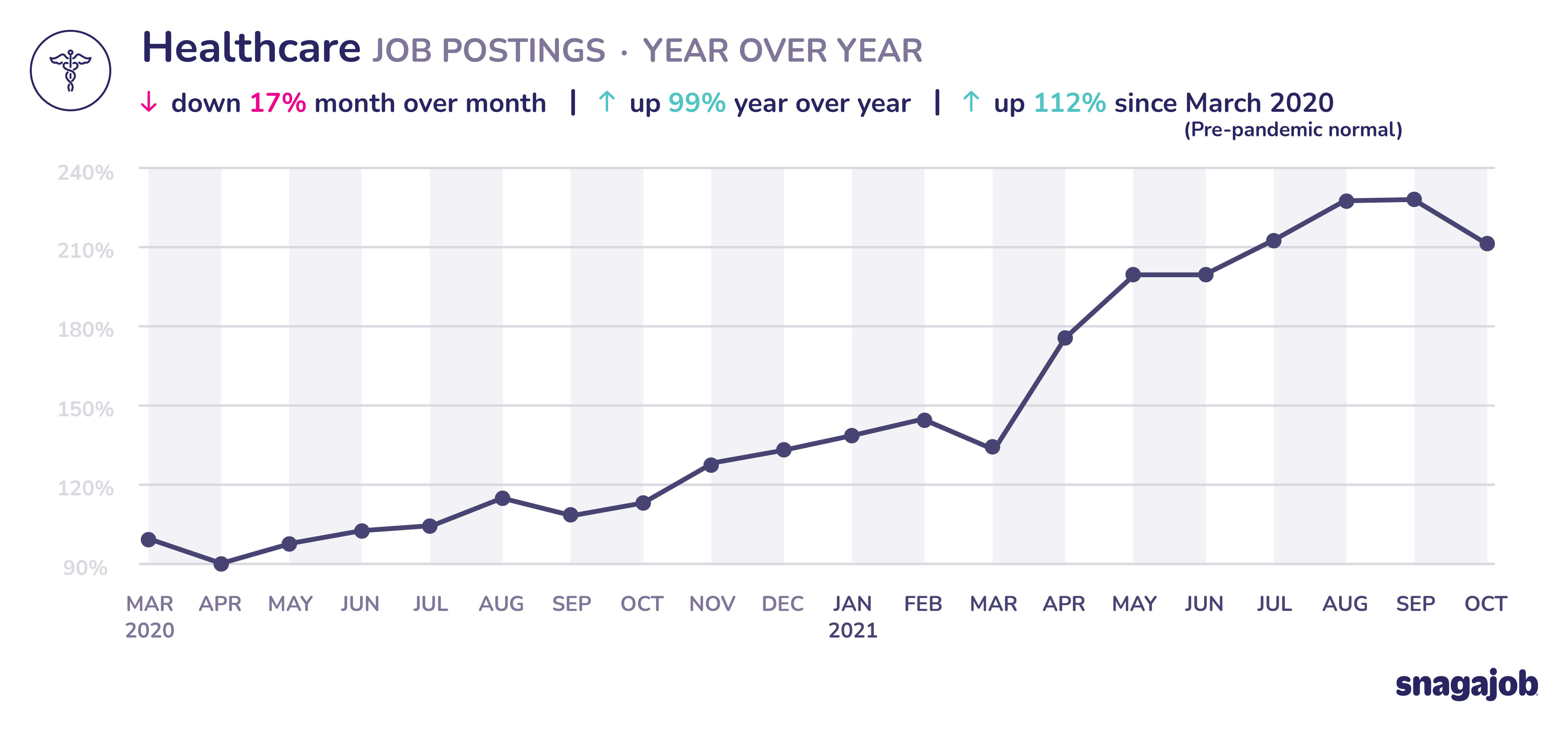 Healthcare jobs are up 112% compared to pre-pandemic norms, seeing a 17% month over month decline and 99% year over year growth.