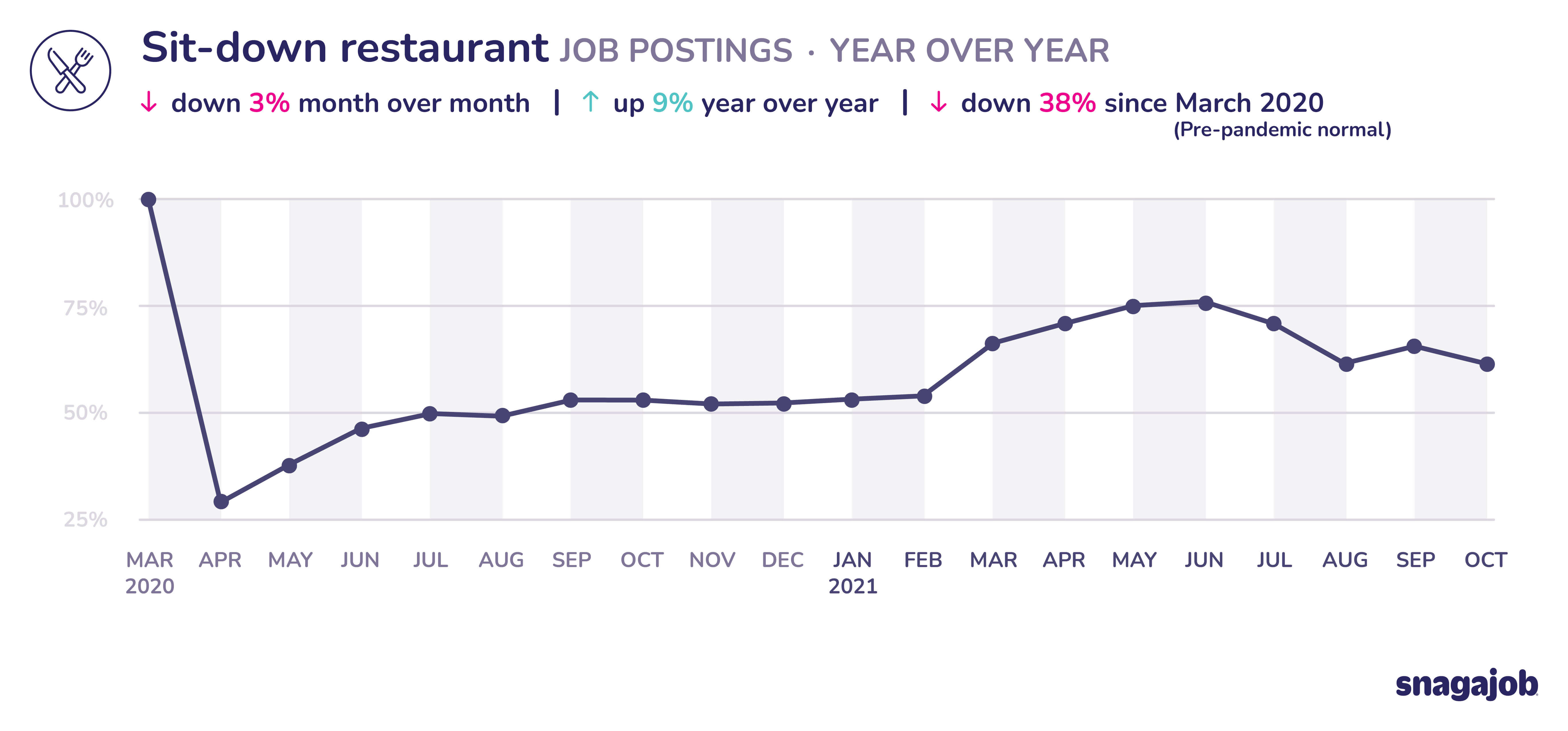 Sit-down restaurant jobs are down 38% compared to pre-pandemic norms, seeing 3% month over month decline and 9% year over year growth.