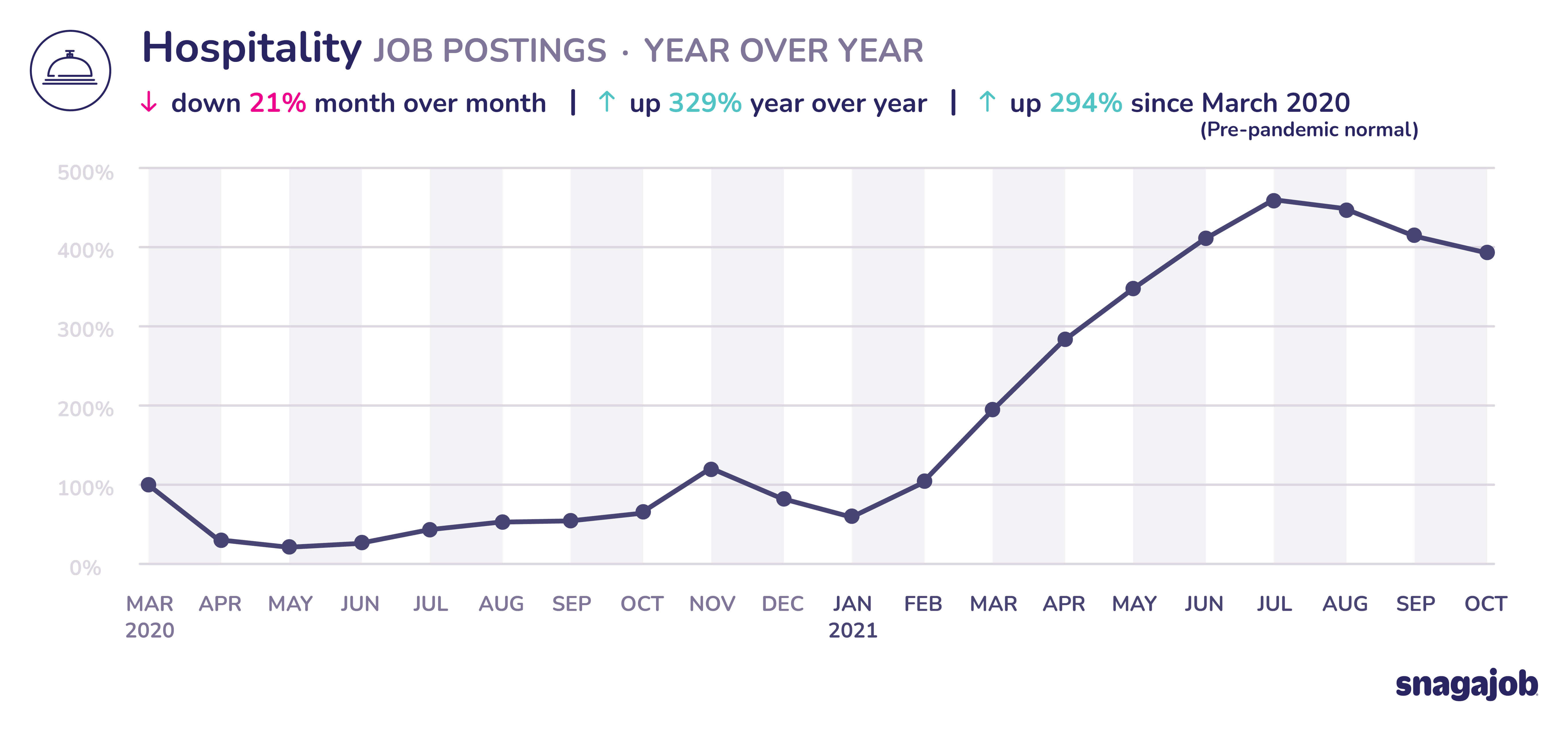 Hospitality jobs are up 294% compared to pre-pandemic norms, seeing a 21% month over month decline and 329% year over year growth.