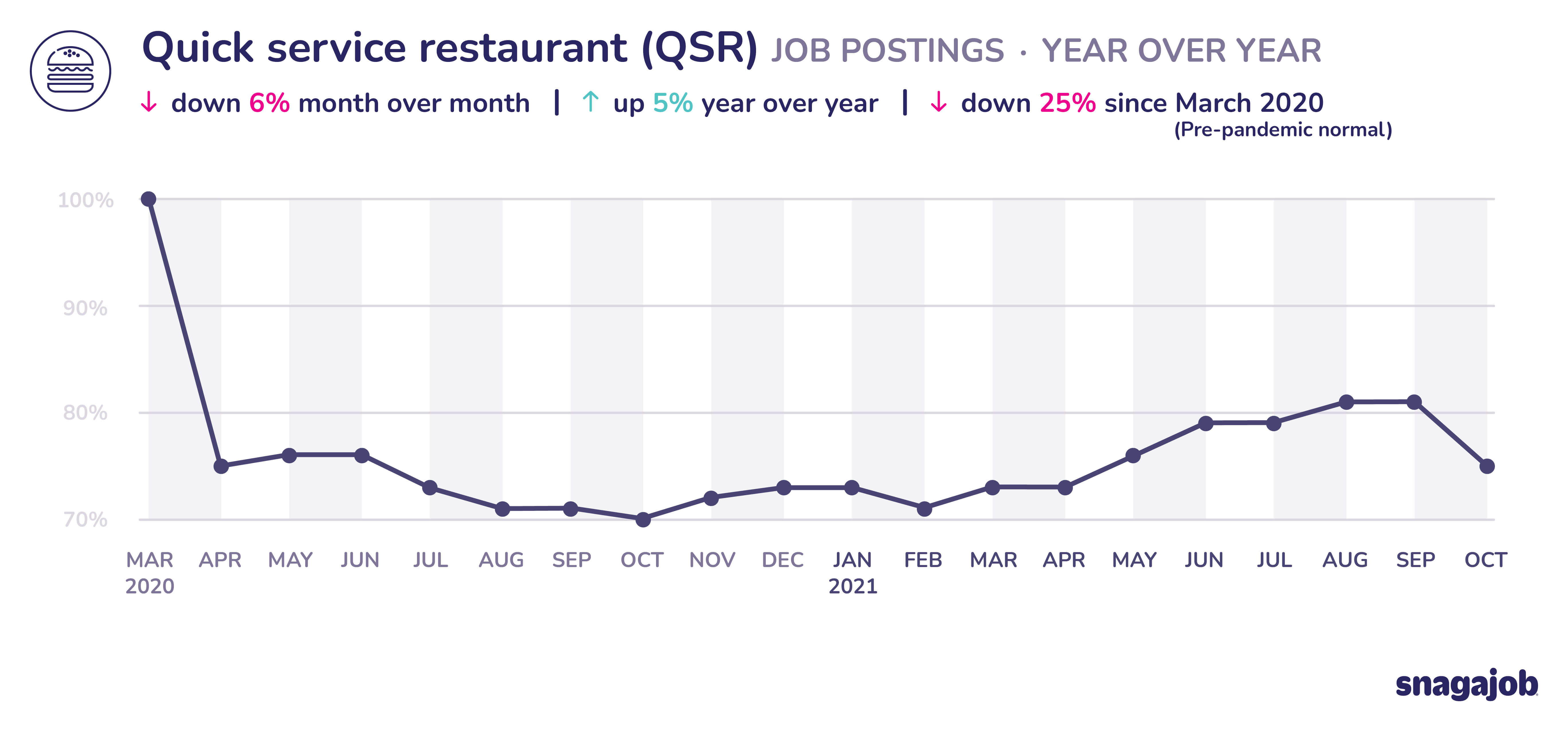 Quick service restaurant (QSR) jobs are down 25% compared to pre-pandemic norms, seeing a 6% month over month decline and 5% year over year growth.