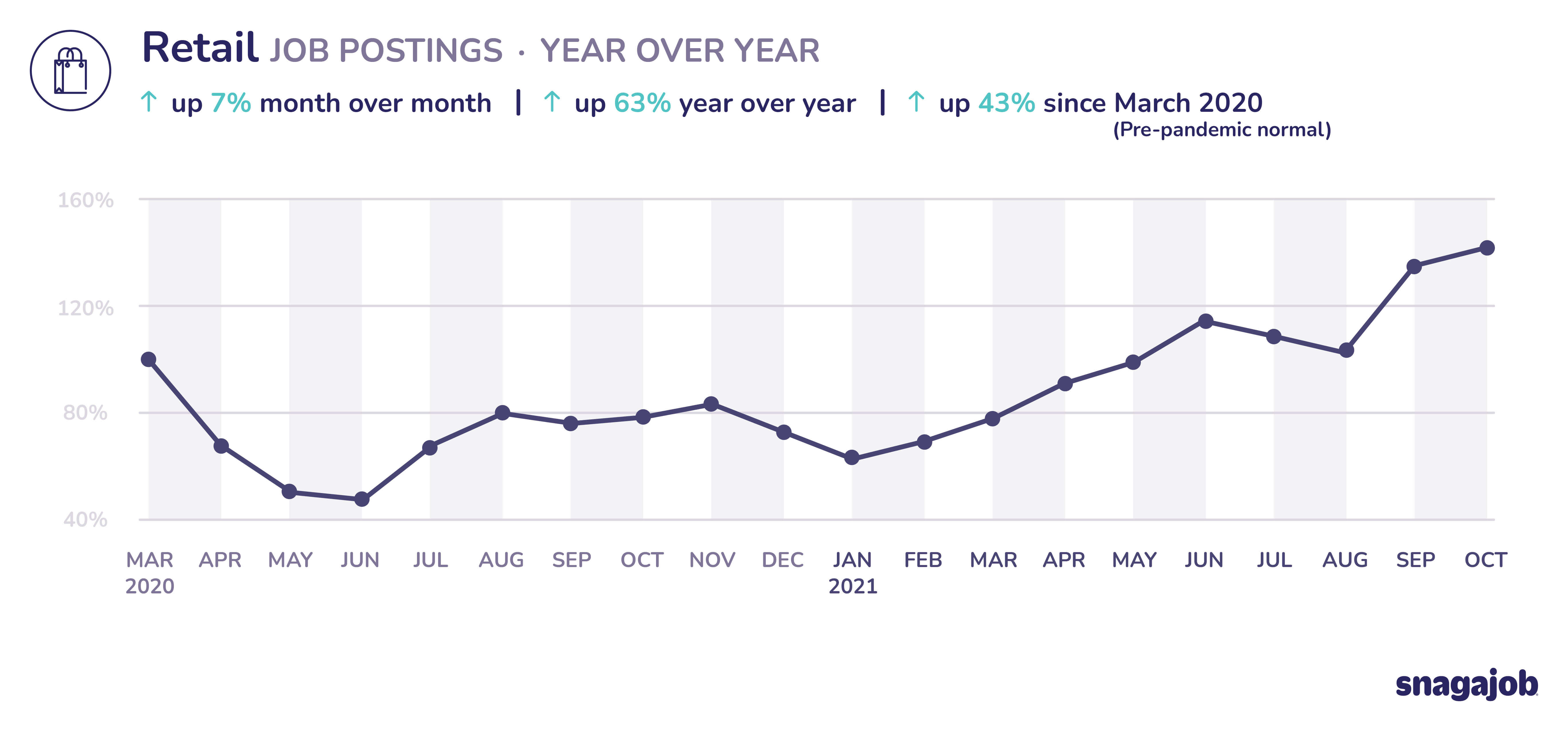 Retail jobs are up 43% compared to pre-pandemic norms, seeing 7% month over month growth and 63% year over year growth.