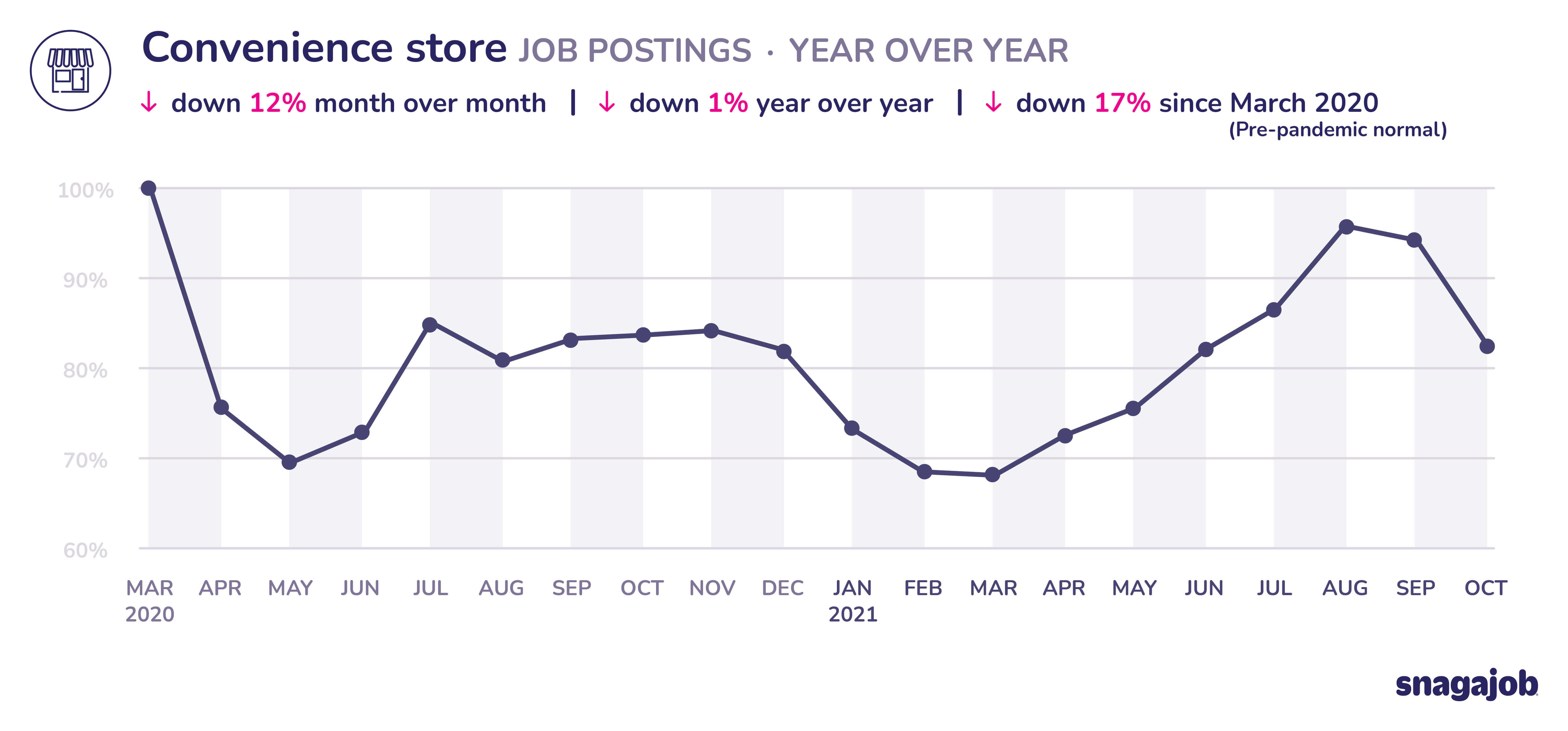 Convenience store jobs are down 17% compared to pre-pandemic norms, seeing 12% month over month decline and a 1% year over year decline.