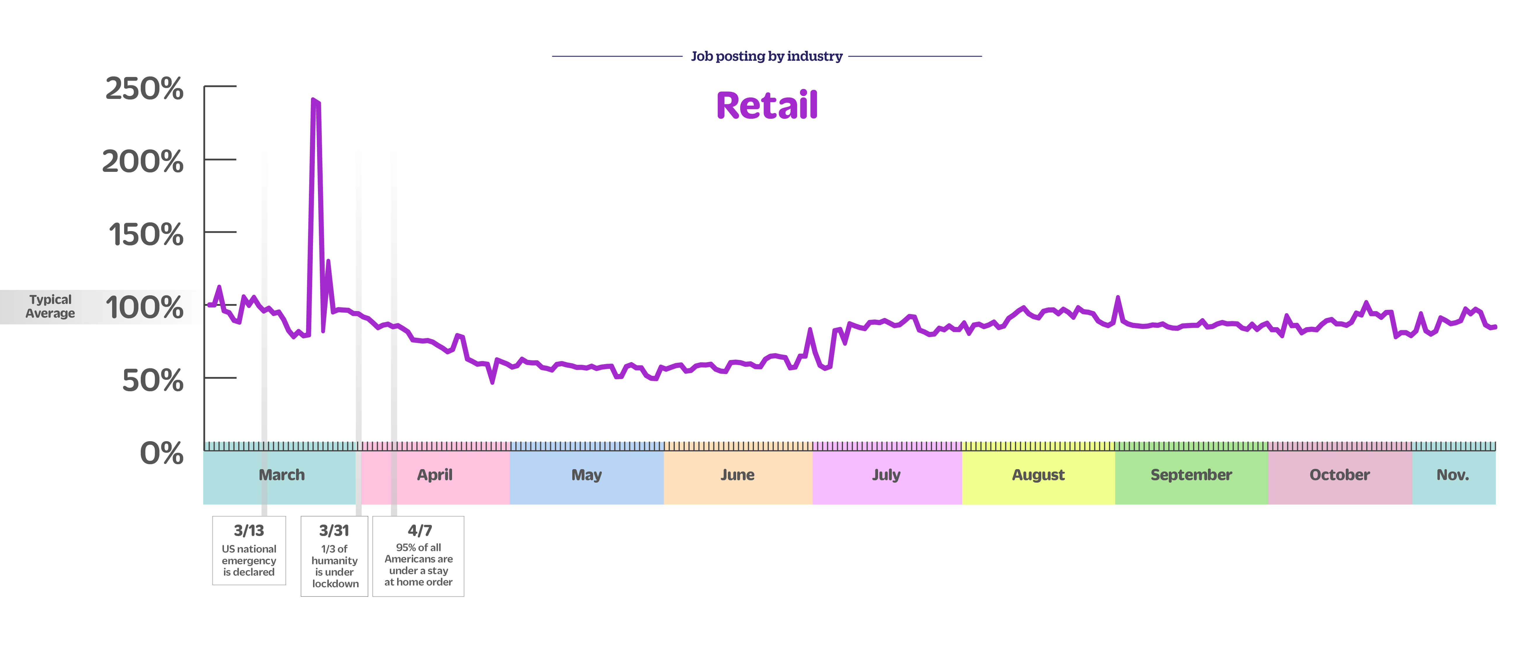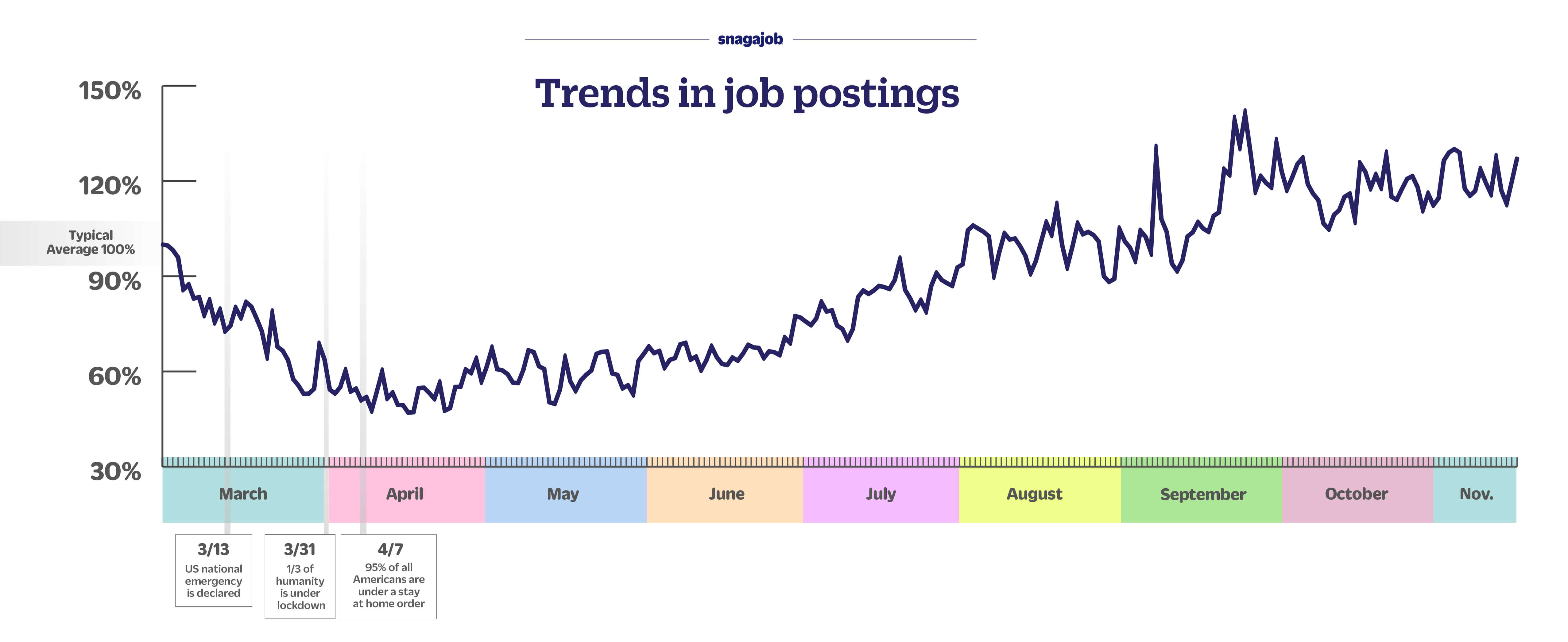 Snagajob is here to help you navigate the hourly hiring landscape during this pandemic. Our proprietary data gives us a unique perspective on hourly job trends and we can see how both workers and employers are responding in real-time. One of the most valuable things we can offer you is a view into these insights and hiring trends. We’re here to give you helpful context as you make business decisions.
