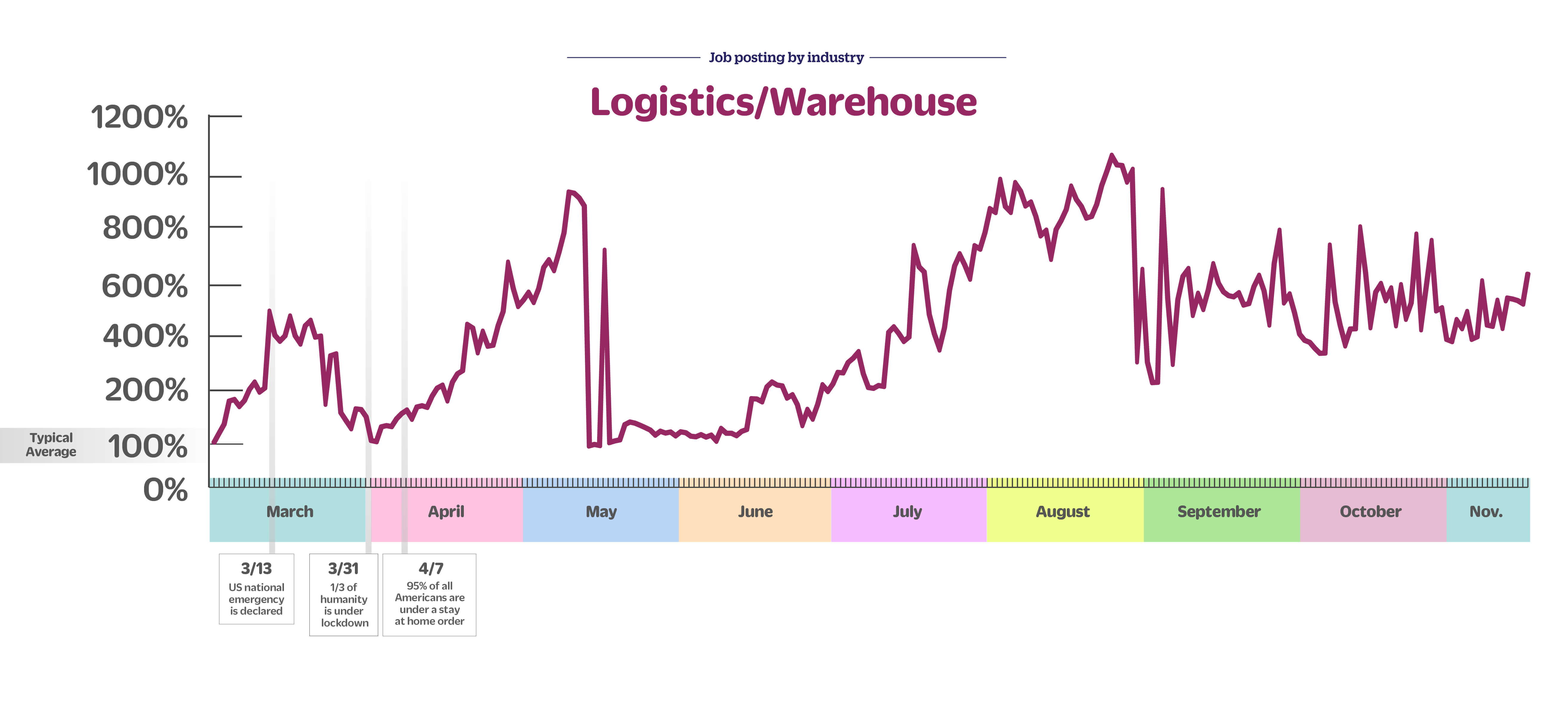 Warehouse and logistics jobs are up 169% week over week, up 160% month over month and up 544% since early March.