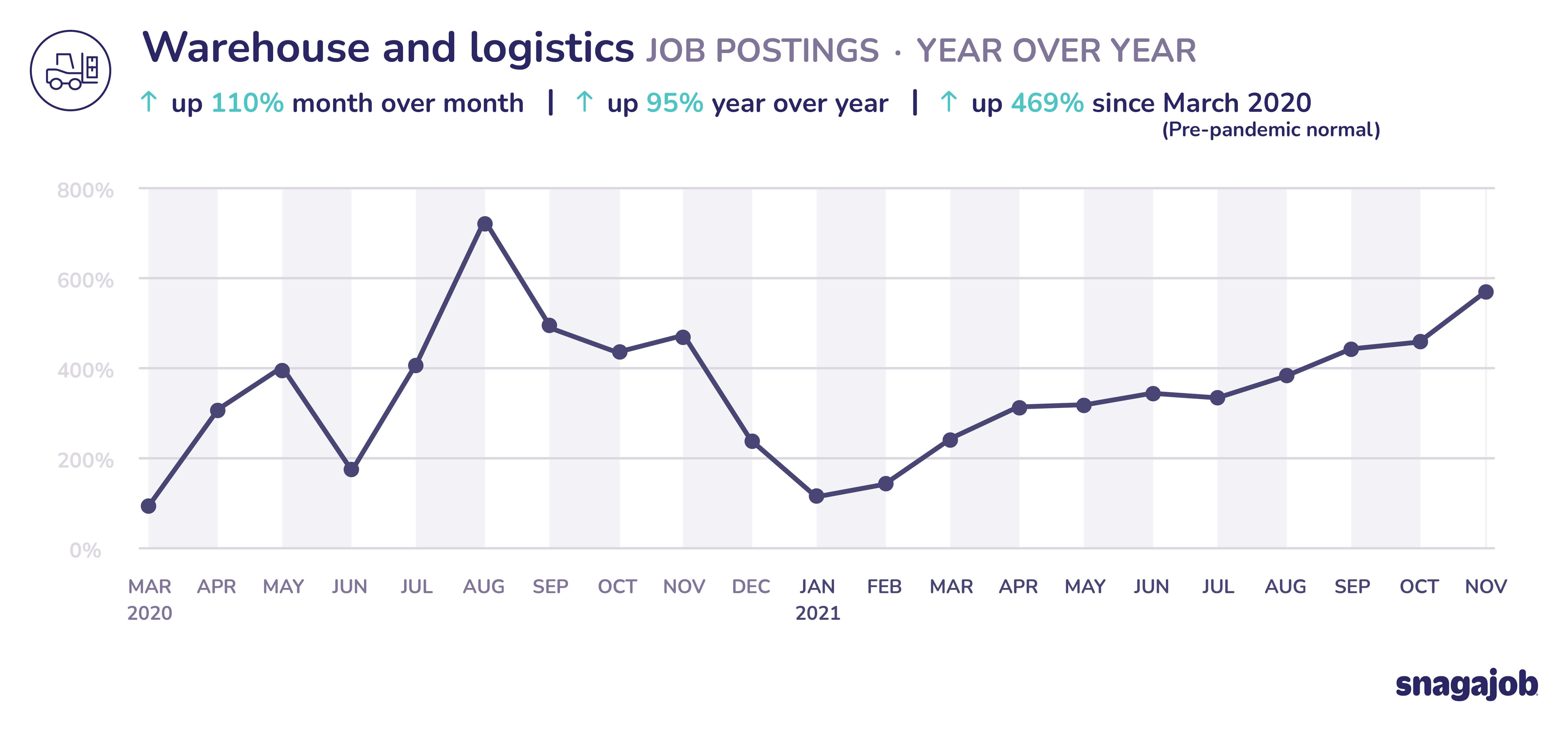 Warehouse and logistics jobs are up 469% compared to pre-pandemic norms, seeing 110% month over month growth and 95% year over year growth.