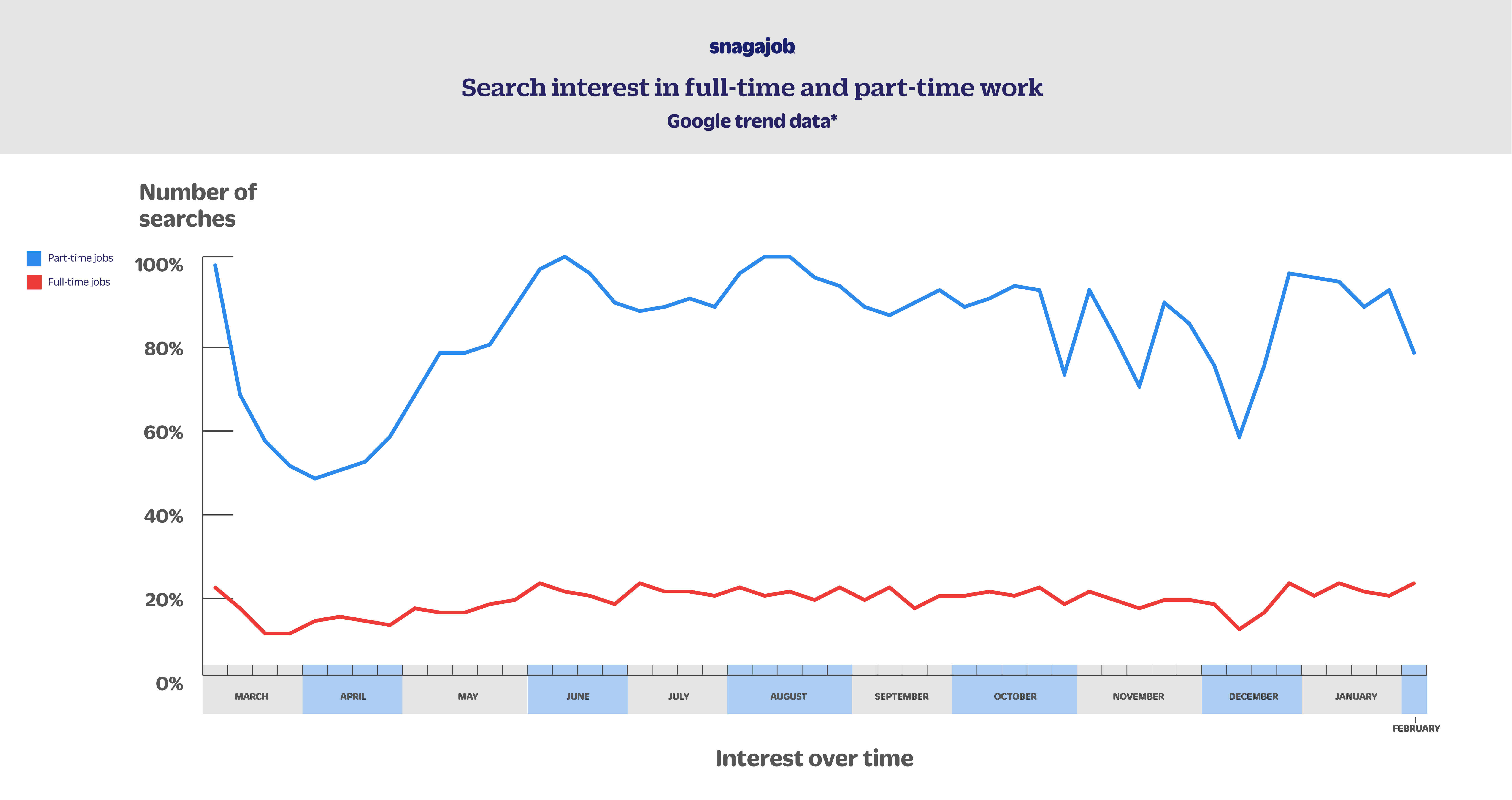 Google searches for part-time jobs are down 15% week over week, down 18% month over month and down 21% since early March.