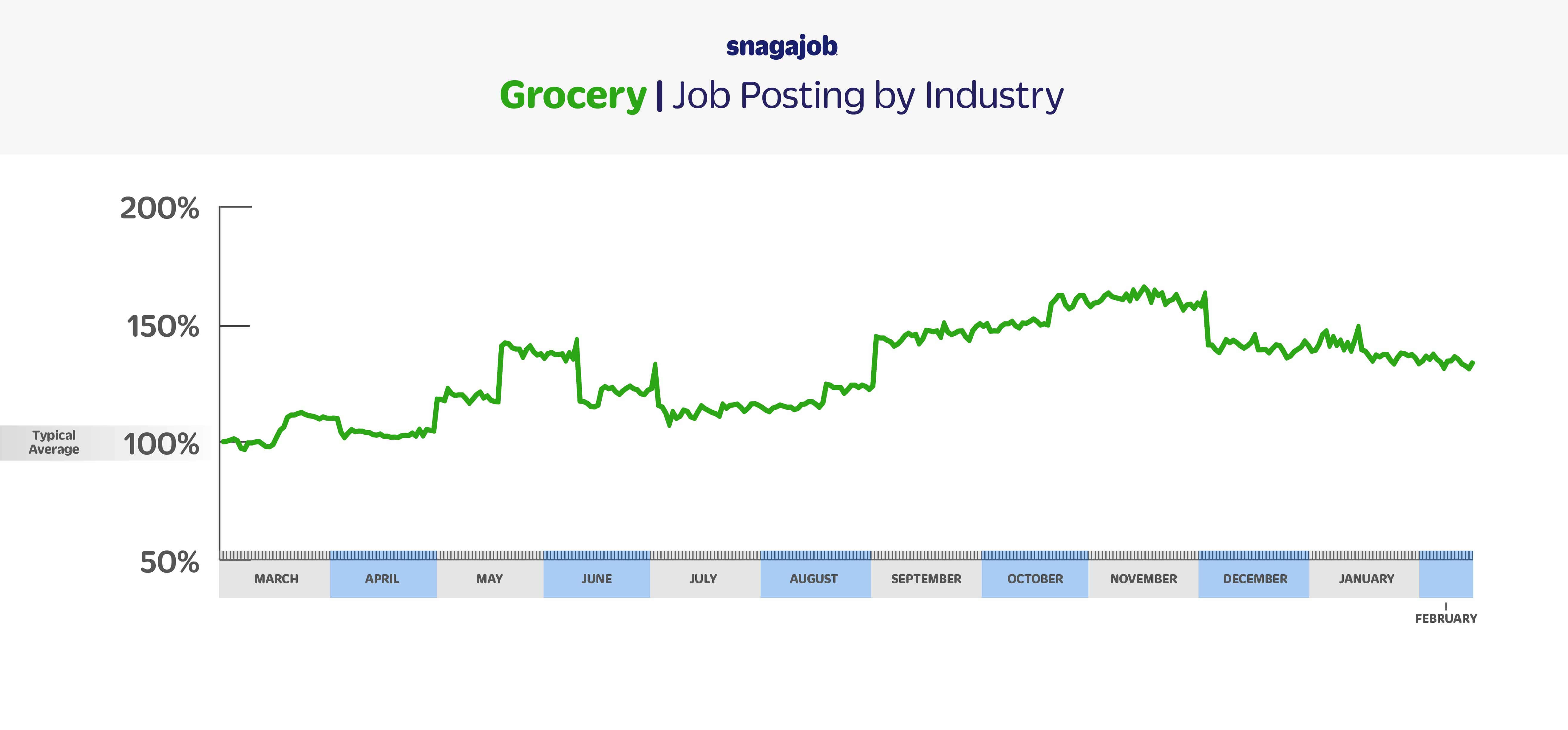 Grocery jobs are down 1% week over week, down 6% month over month and up 34% since early March.