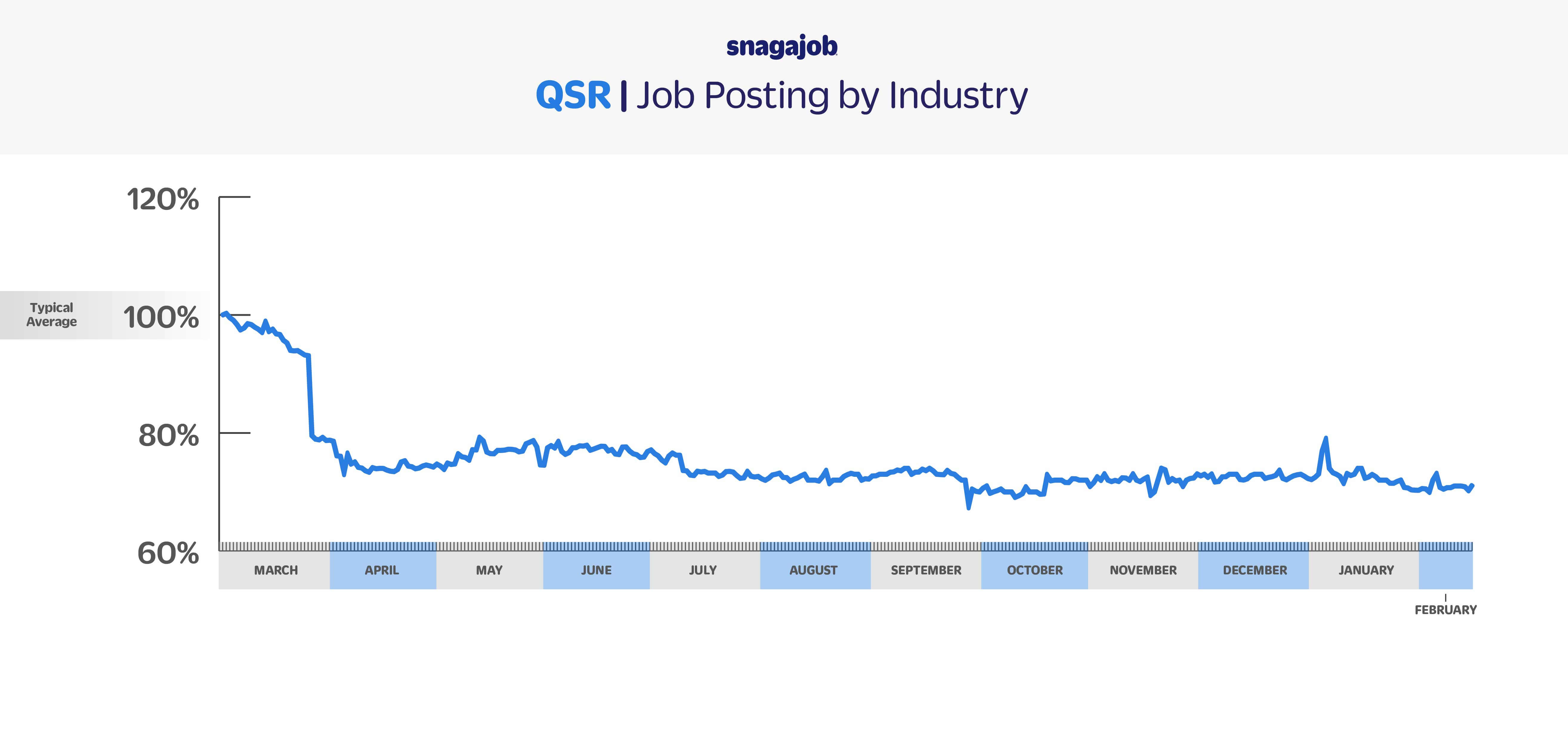 Quick service restaurant (QSR) jobs are flat week over week, down 3% month over month and down 29% since early March.