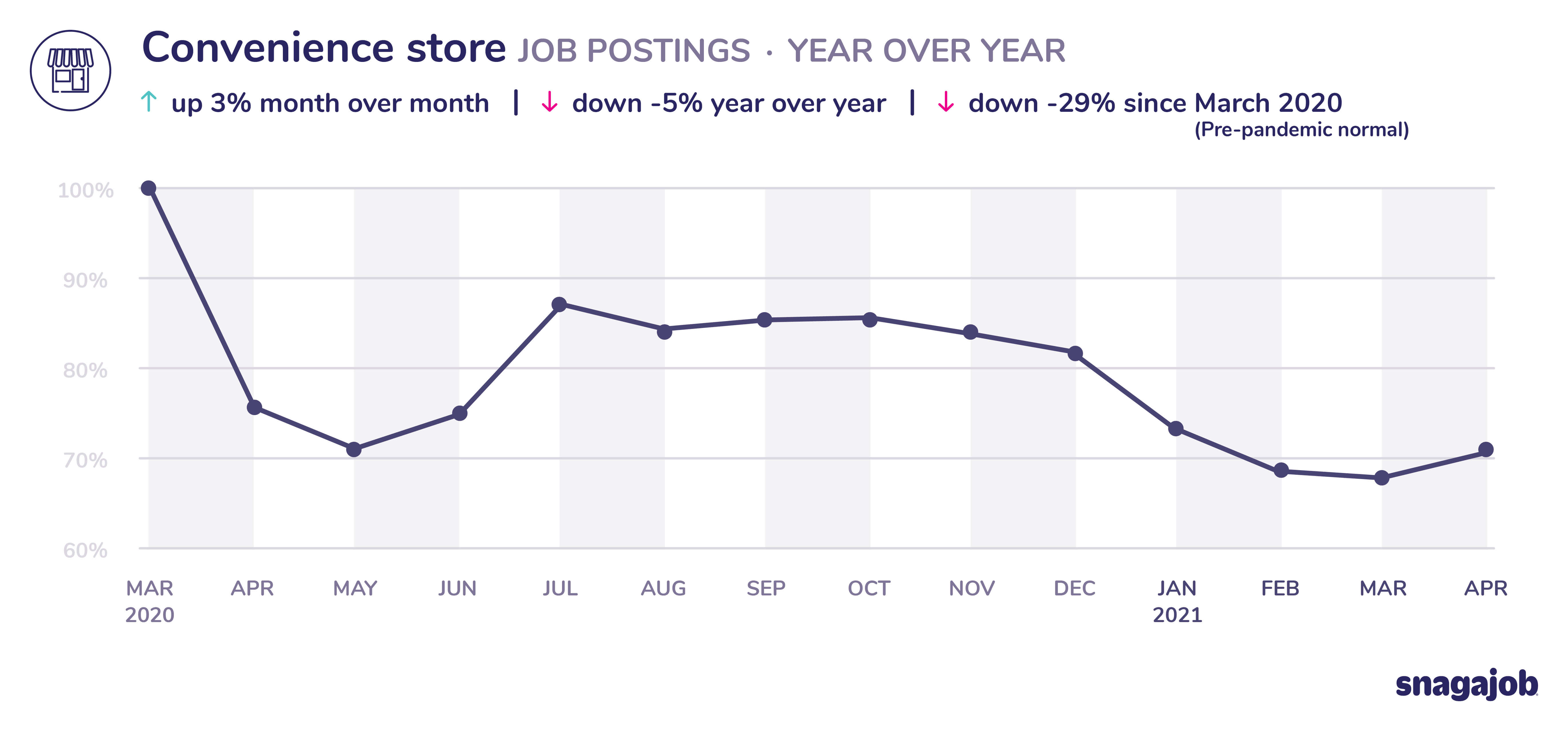 Convenience store jobs are down 29% compared to pre-pandemic norms, seeing 3% month over month growth and a 5% year over year decline.